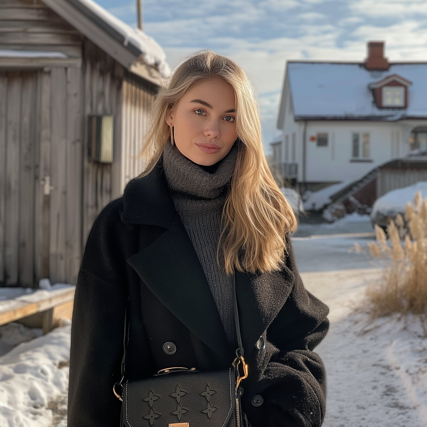 Young woman in winter attire with a black coat and handbag, standing in a snowy village setting with wooden houses and snow-covered roofs.