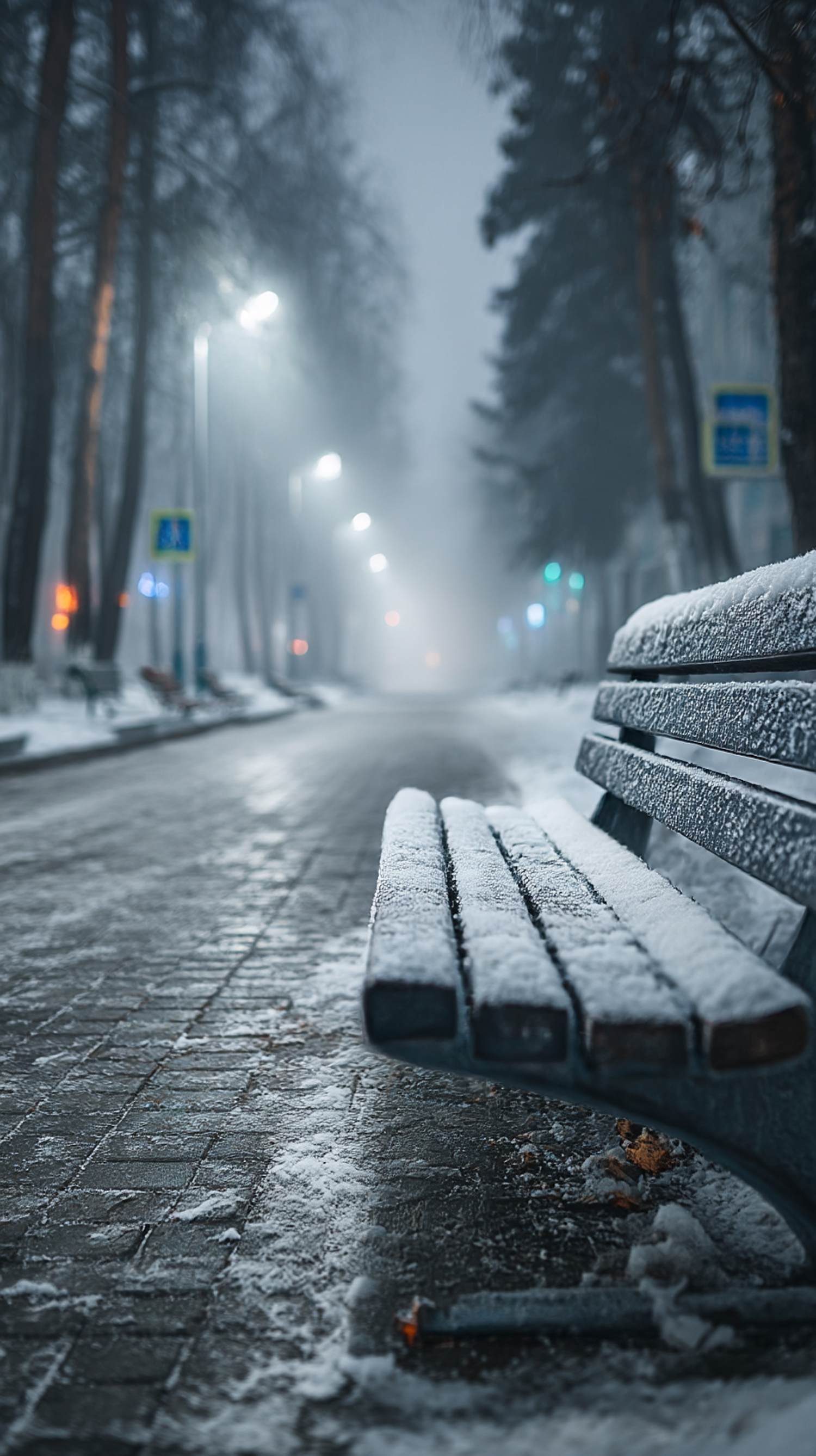 A snow-covered bench on a foggy winter street, illuminated by soft streetlights, creating a serene and tranquil atmosphere.