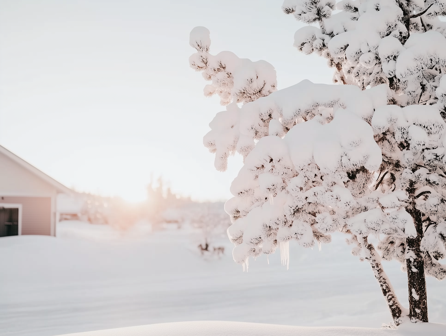 Snow-laden tree with icicles in a serene winter landscape, warm sunlight casting a golden glow over the snowy scene.