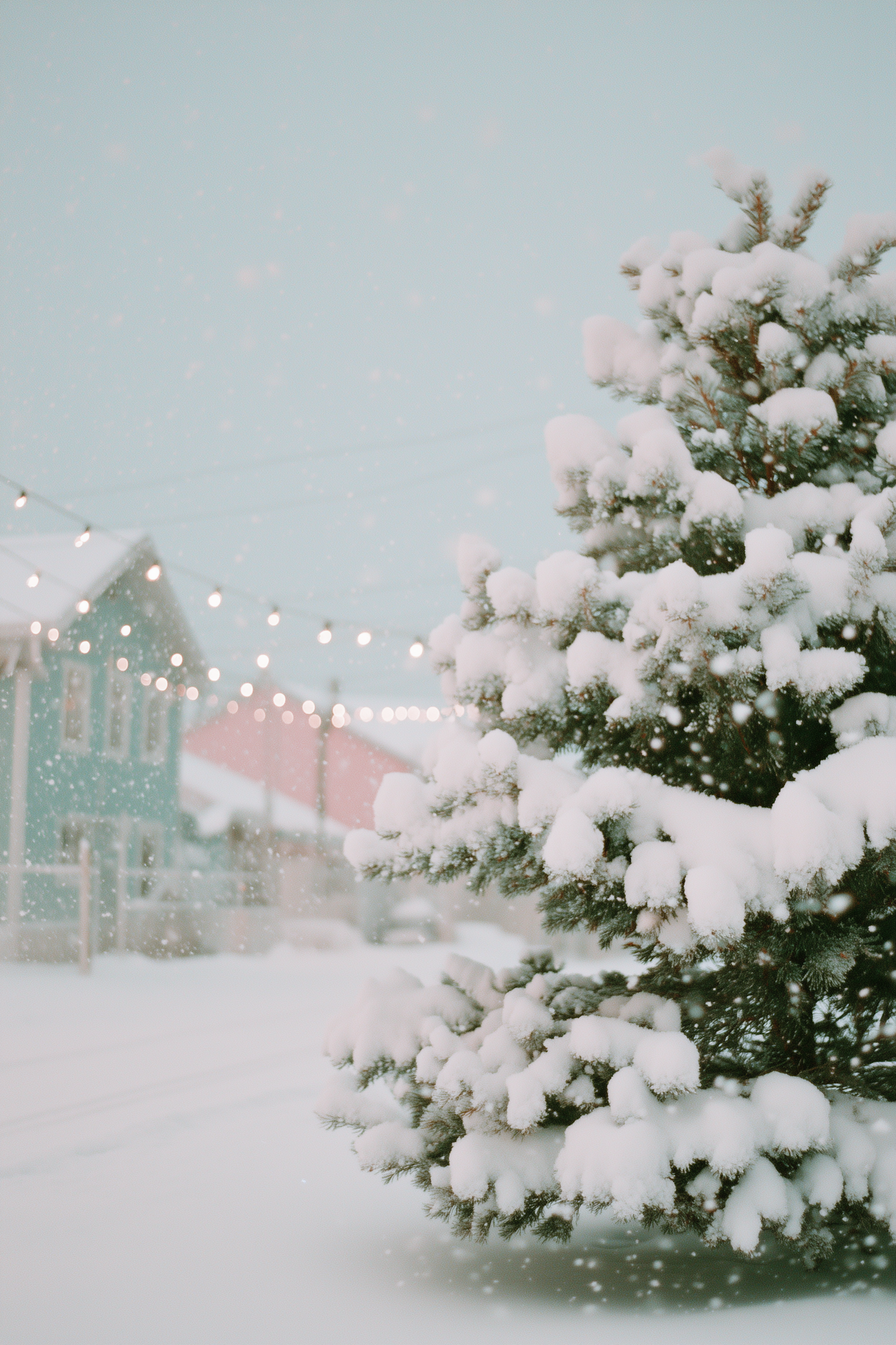 A snow-covered tree with a pastel house and string lights in the background, creating a serene winter atmosphere.