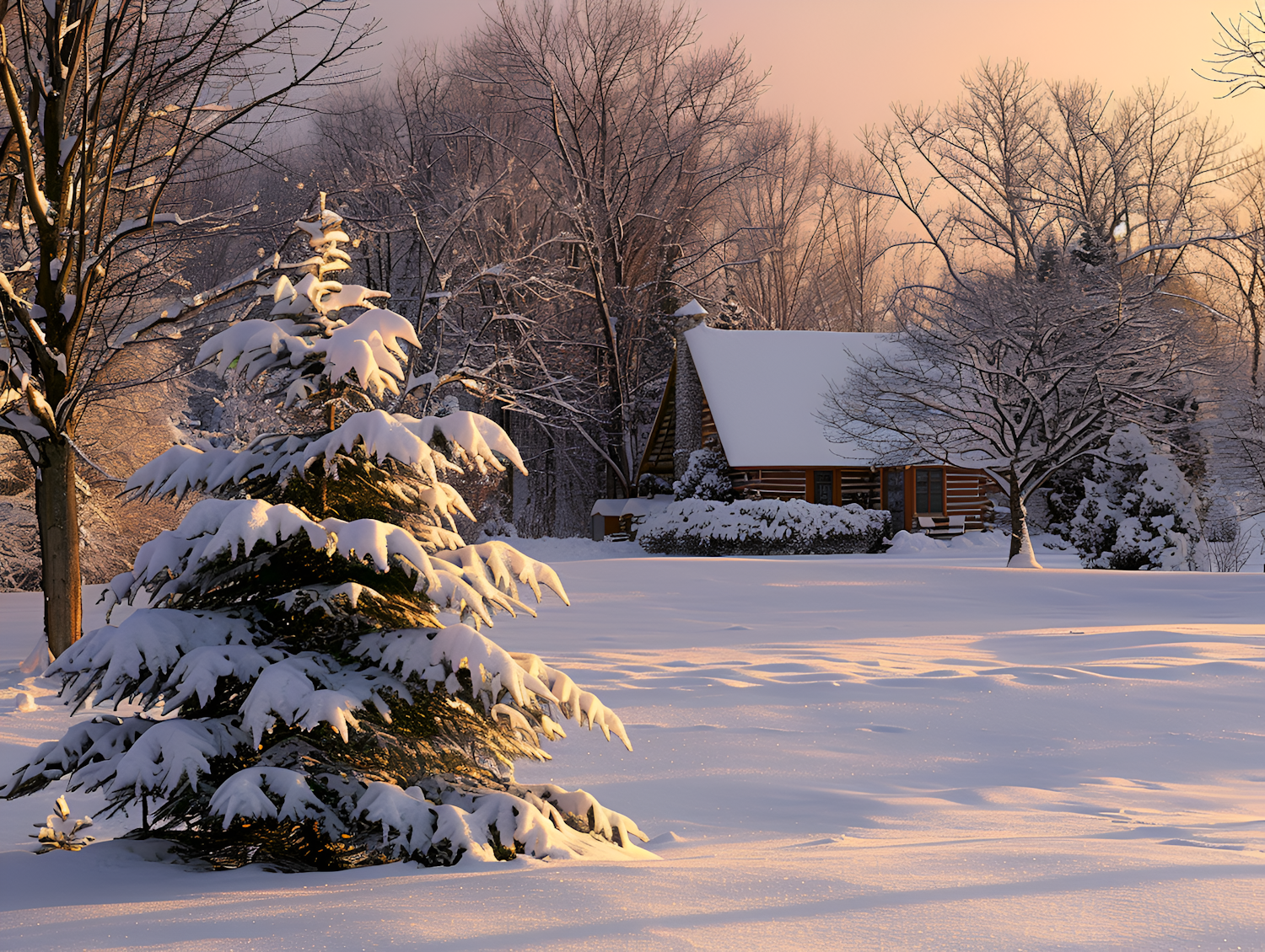 Snow-covered pine tree and log cabin at sunset, creating a serene winter landscape with golden light and tranquil atmosphere.