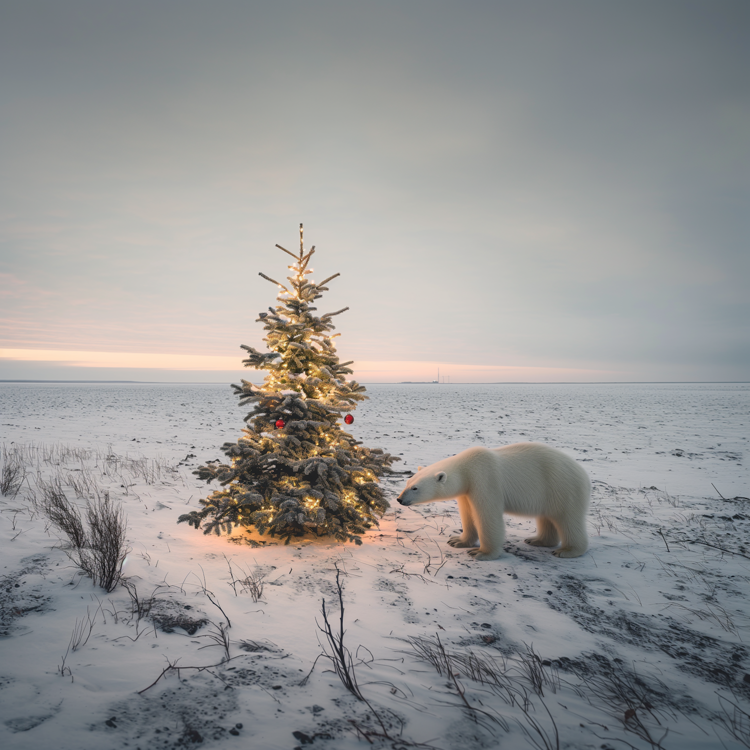 A polar bear explores a lit Christmas tree in a snowy landscape, blending wilderness with festive charm.
