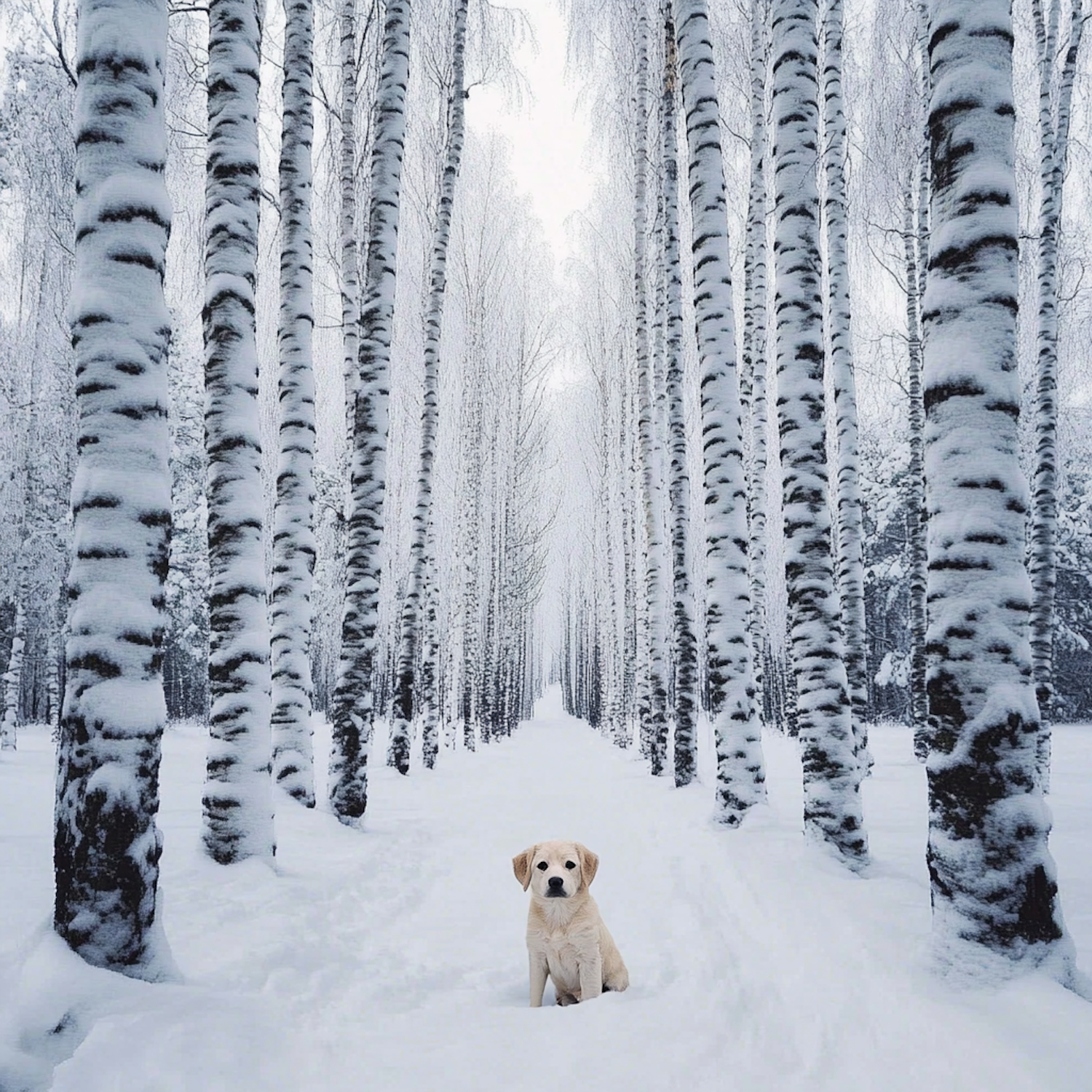 A cute Labrador puppy sits in a snowy birch forest, surrounded by tall, snow-covered trees. A serene winter wonderland scene.