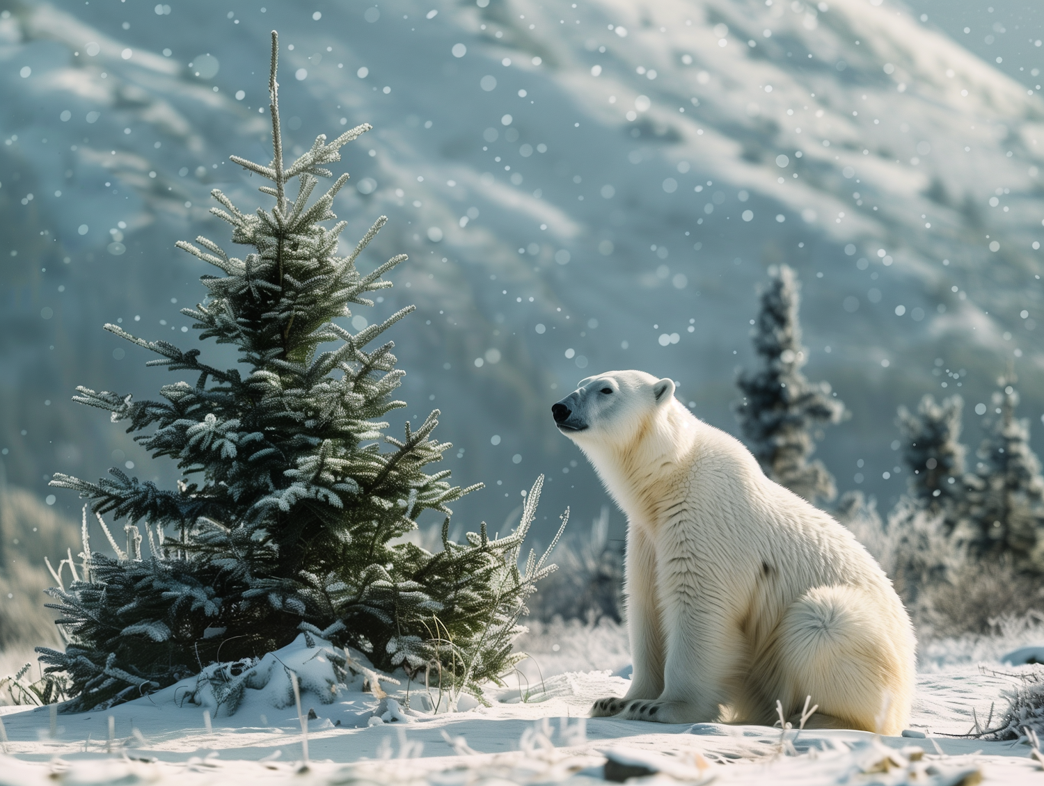A polar bear sits by a snow-dusted evergreen tree in a serene winter landscape, with gentle snowfall and snowy hills in the background.