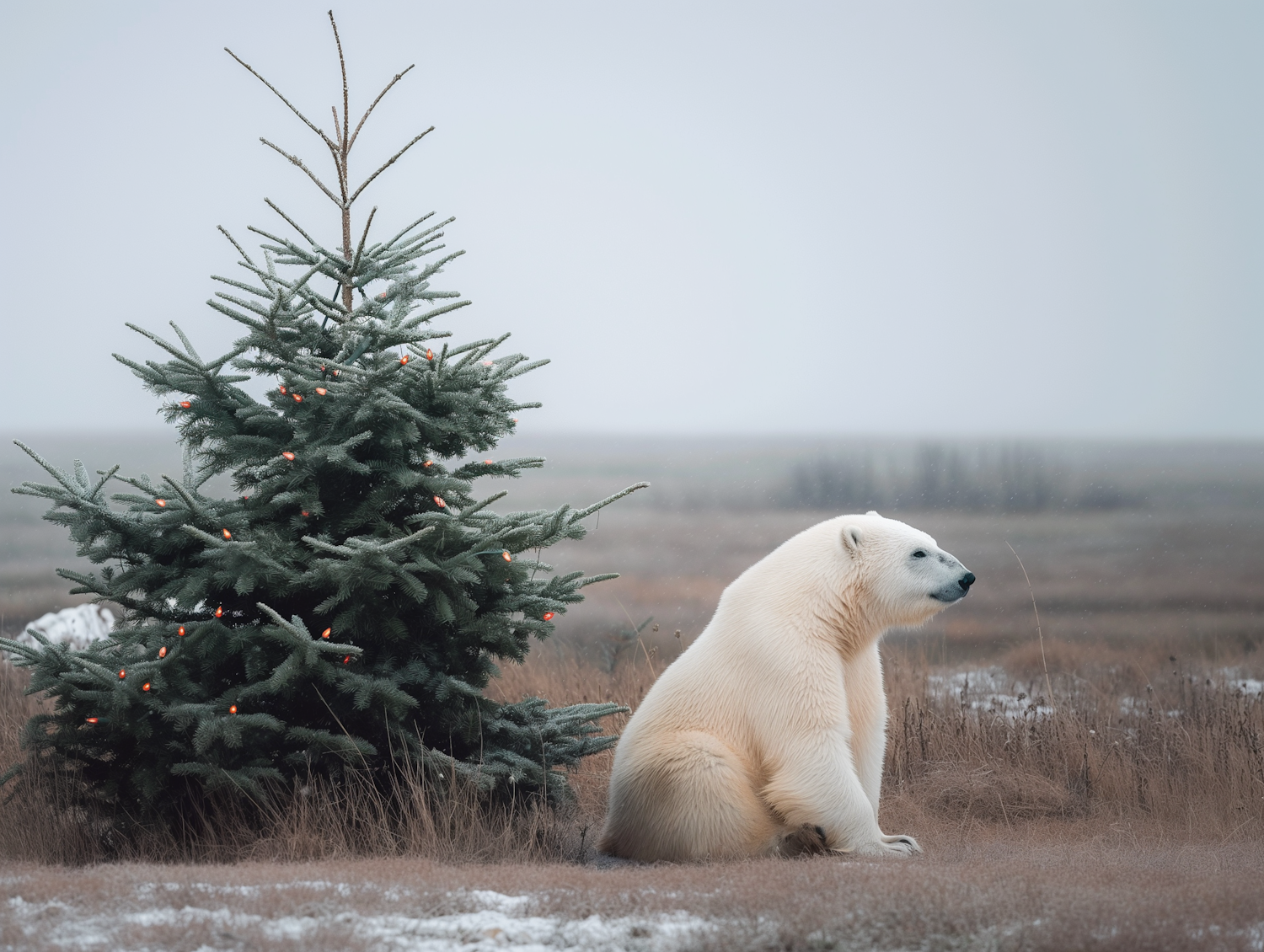 Polar bear sits beside a Christmas-lit tree in a snowy field, creating a serene and festive winter scene.