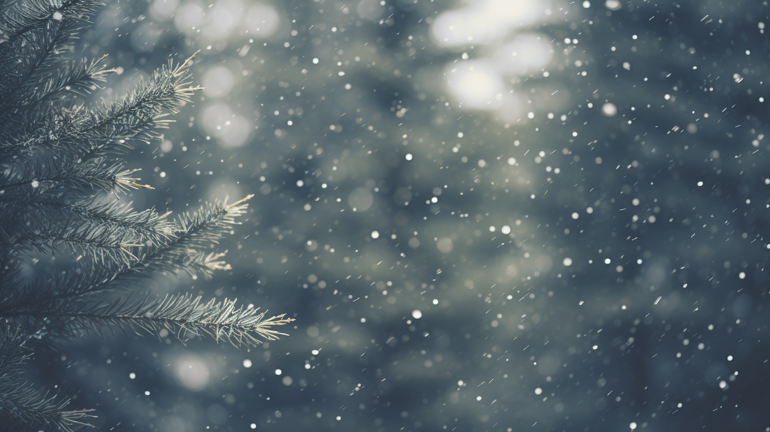 Serene winter scene with snow falling on evergreen branches, creating a peaceful and calming atmosphere.