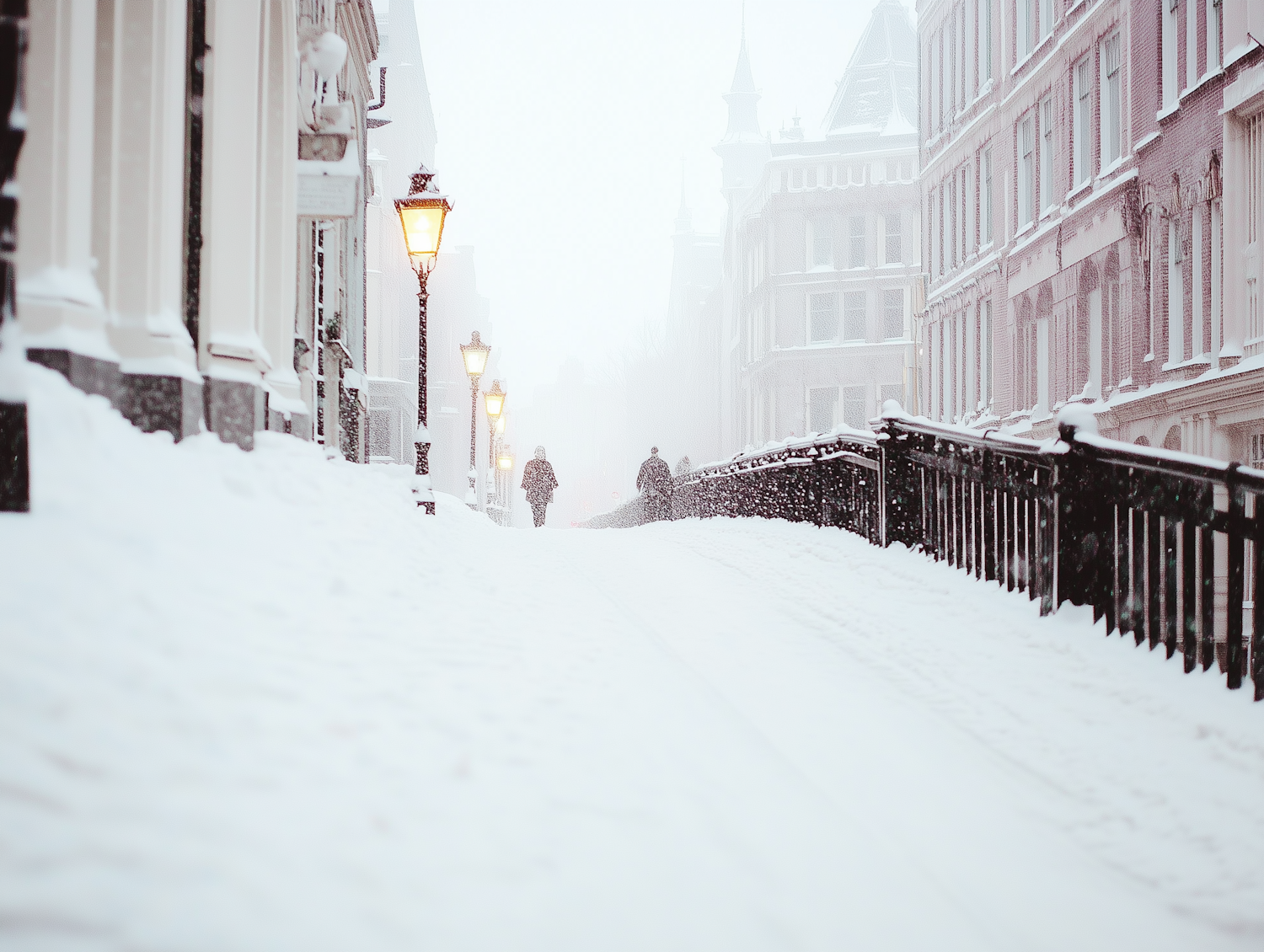Snow-covered street with vintage lamps and European buildings, two people walking in the distance, serene winter atmosphere.