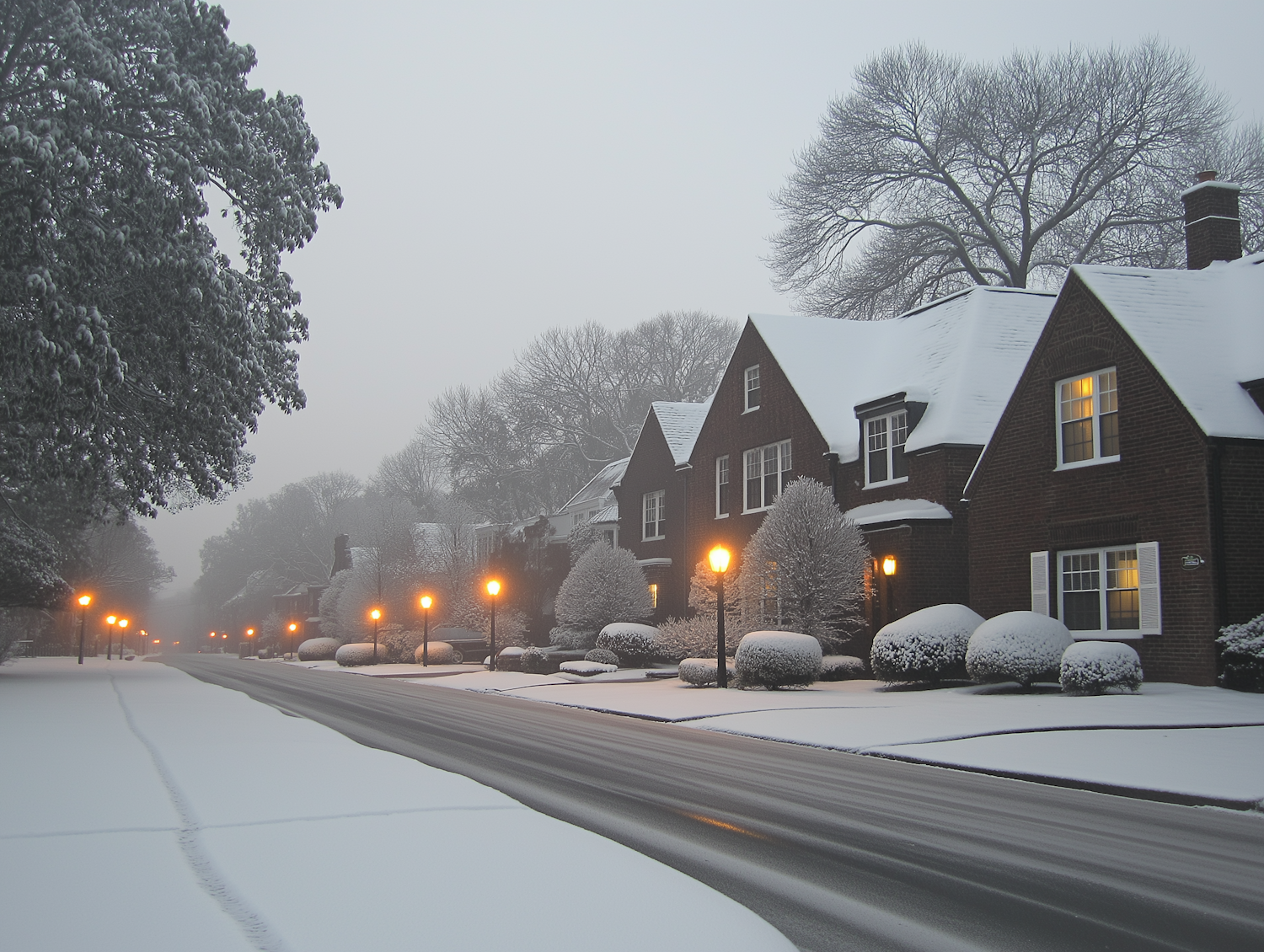 Snow-covered suburban street with brick houses, glowing street lamps, and bare trees in a tranquil winter setting.