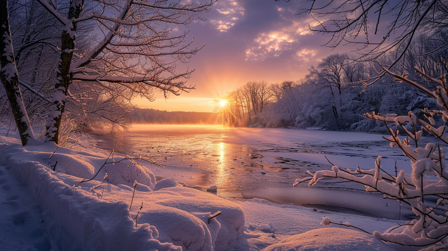 Stunning winter sunset over a snow-covered lake, with golden reflections and snow-laden trees creating a serene landscape.