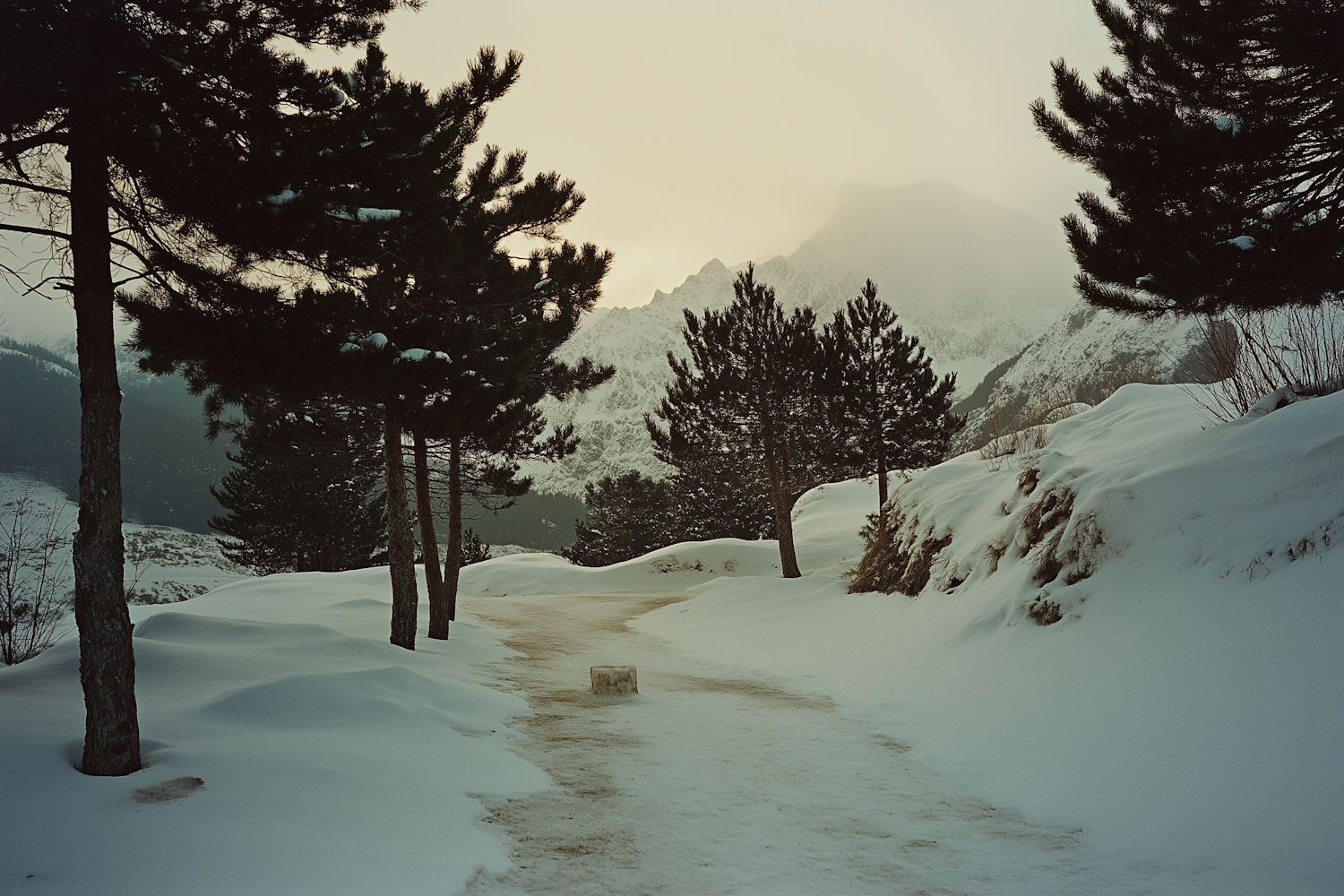 Serene winter landscape with snow-covered path, pine trees, and misty mountains under a soft yellow sky.