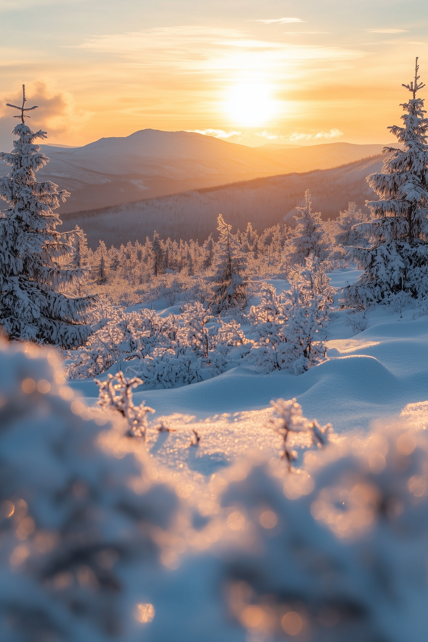 Golden winter sunset over snow-covered trees and hills, with frosted branches glistening in serene, warm light.