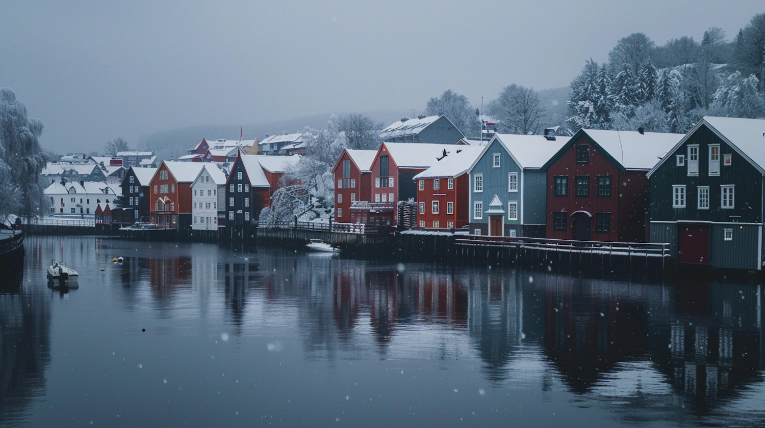 Charming riverside town with colorful houses, snowy roofs, and a serene winter river reflecting the tranquil scene.