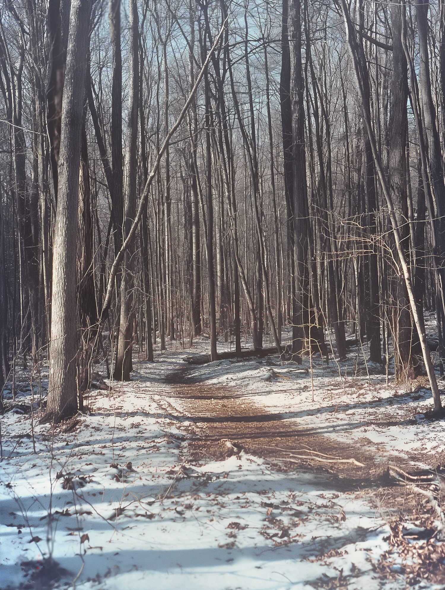 Tranquil winter forest with snow-dusted path and tall, leafless trees under a clear blue sky.