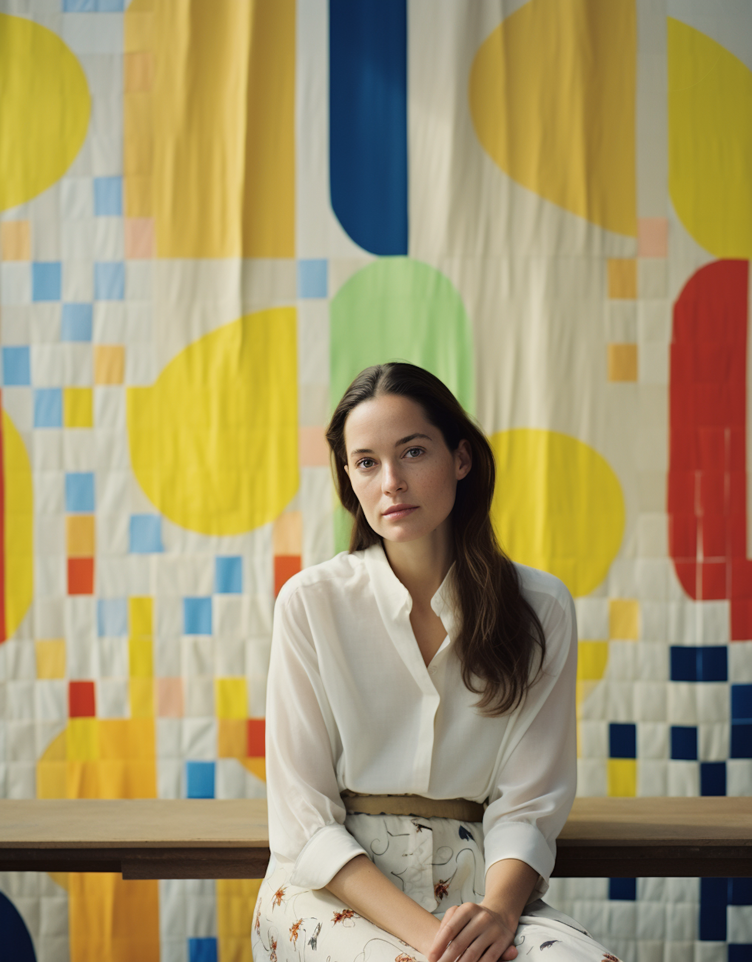Woman in white blouse against colorful geometric wall art, sitting at a wooden table with a calm expression.