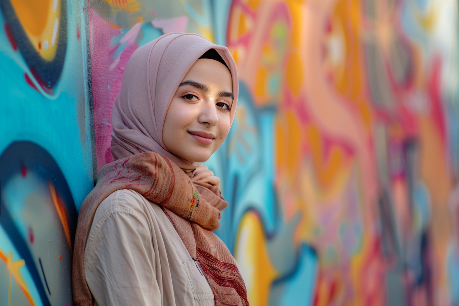 Young woman in a pink hijab against a colorful graffiti wall, exuding confidence and style in a vibrant urban setting.