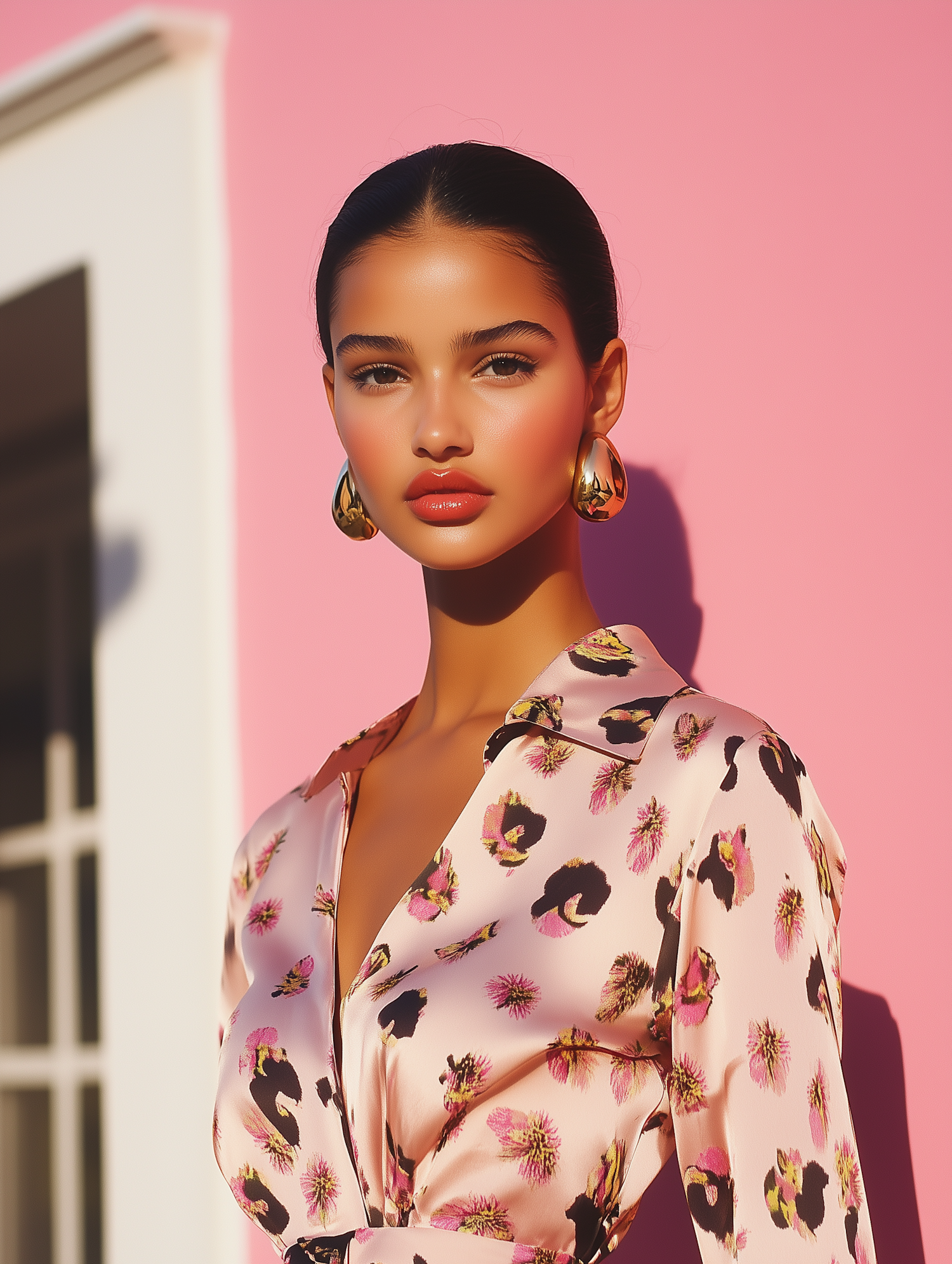 Stylish woman with gold earrings and floral blouse against a pink wall, exuding elegance and confidence.