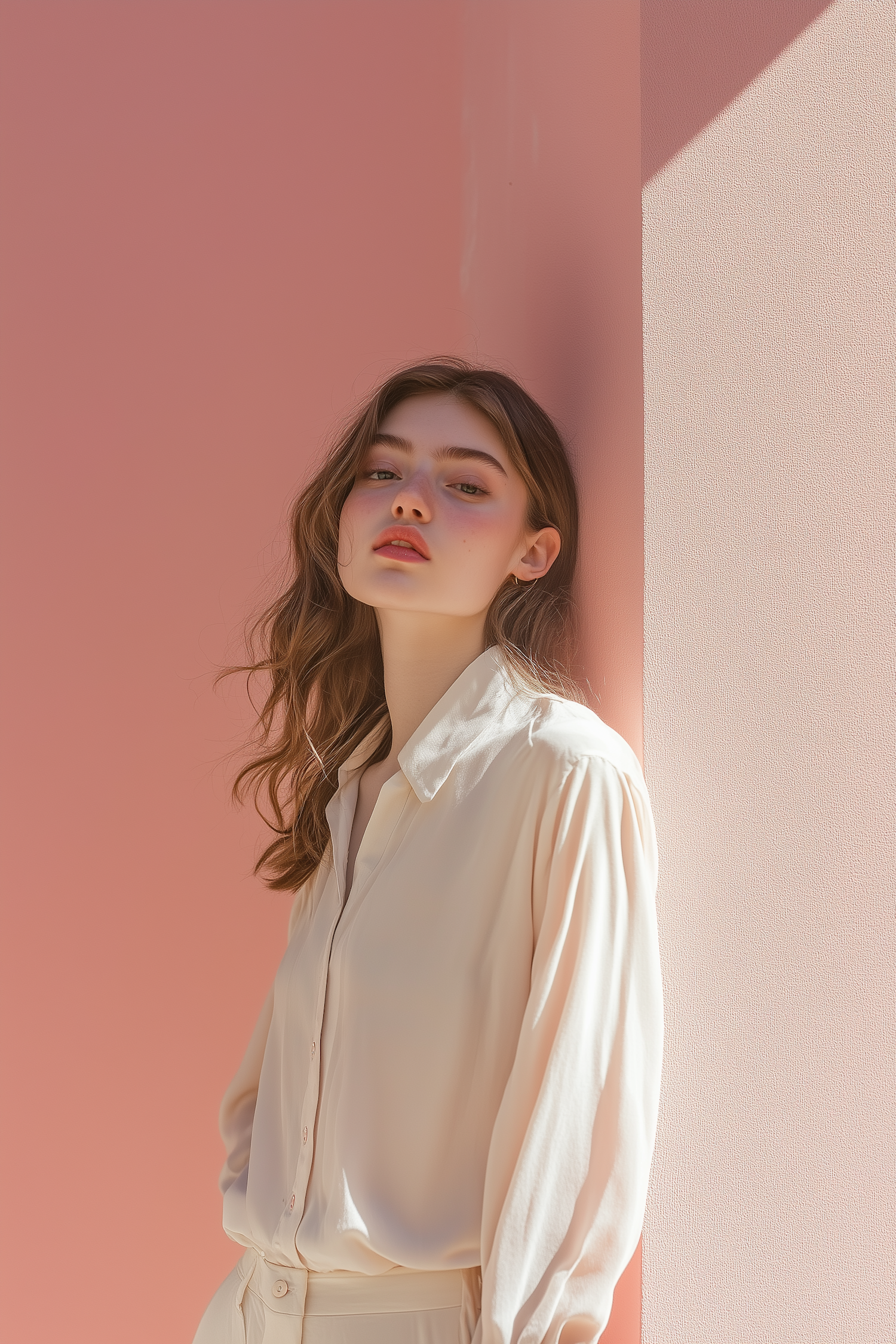 Young woman with wavy brown hair in a cream blouse against a pink wall, exuding elegance and calmness in soft lighting.