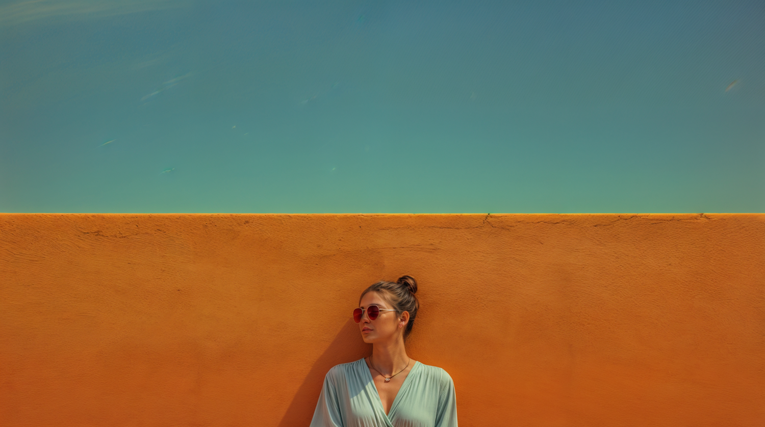 Woman in sunglasses against a vibrant orange wall with a clear blue sky, creating a striking minimalist composition.