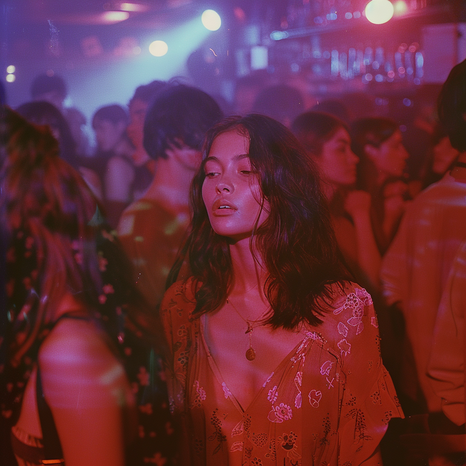 A young woman in a floral dress enjoys a vibrant nightclub scene, surrounded by colorful lights and dancing people.
