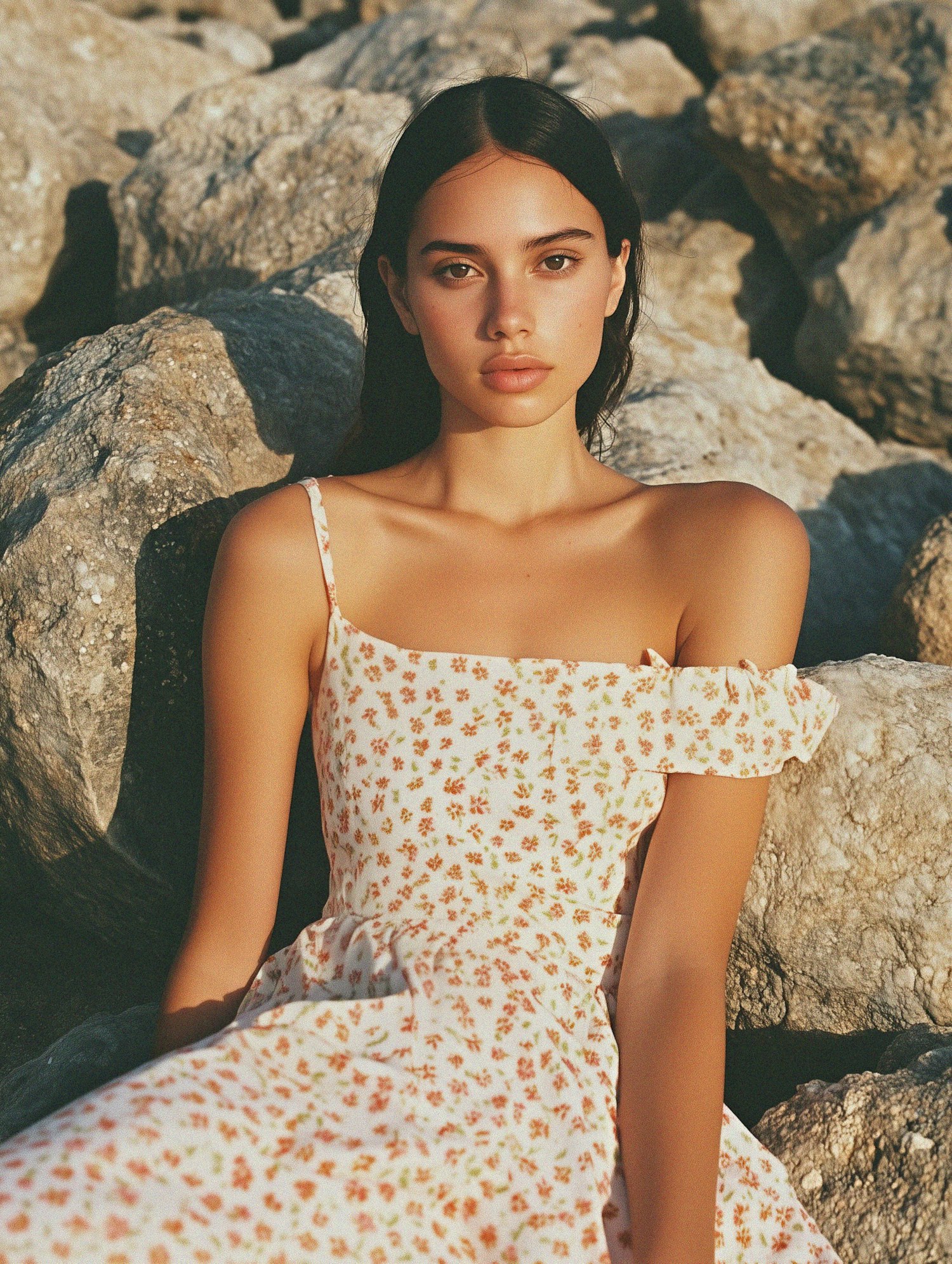 A serene portrait of a woman in a floral dress, sitting against sunlit rocks, with warm natural tones and a calm expression.