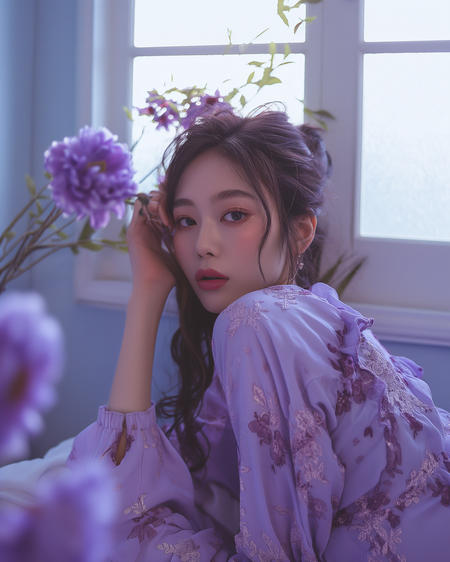 Elegant Asian woman in lavender dress surrounded by purple flowers, creating a serene and dreamy atmosphere.