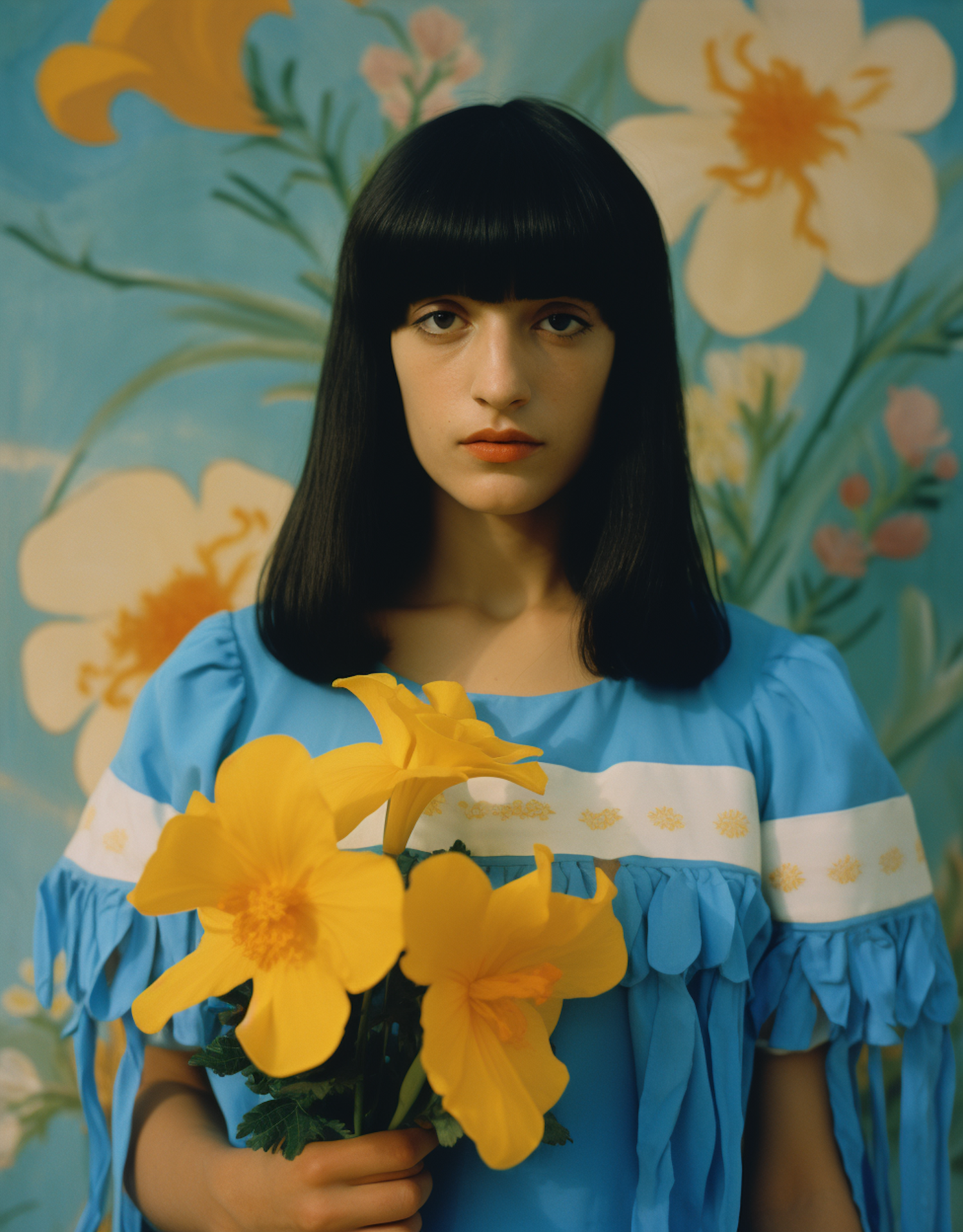 Young woman in a blue dress holding yellow flowers, set against a vibrant floral background.