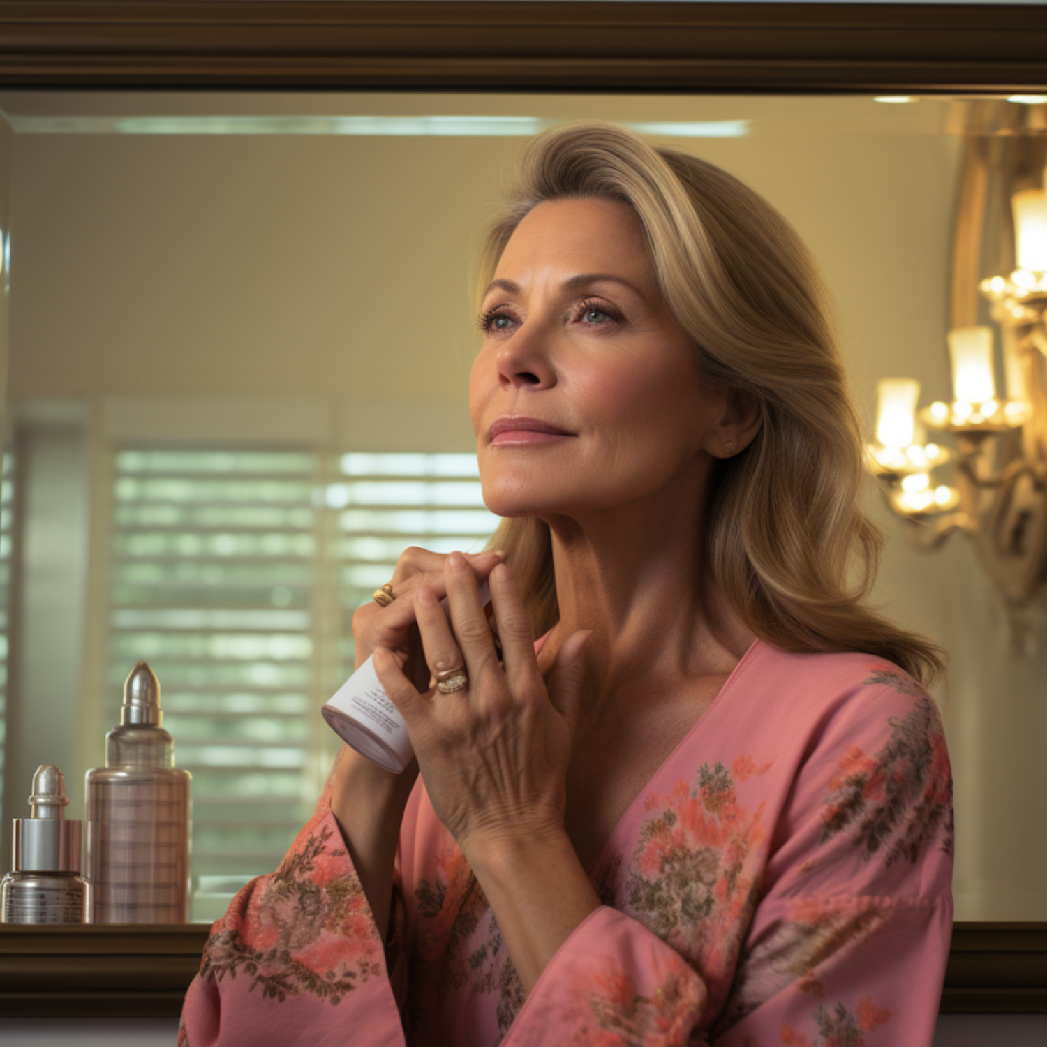 Elegant woman in pink robe holds skincare product, reflecting in mirror with serene expression. Luxurious bottles add sophistication.