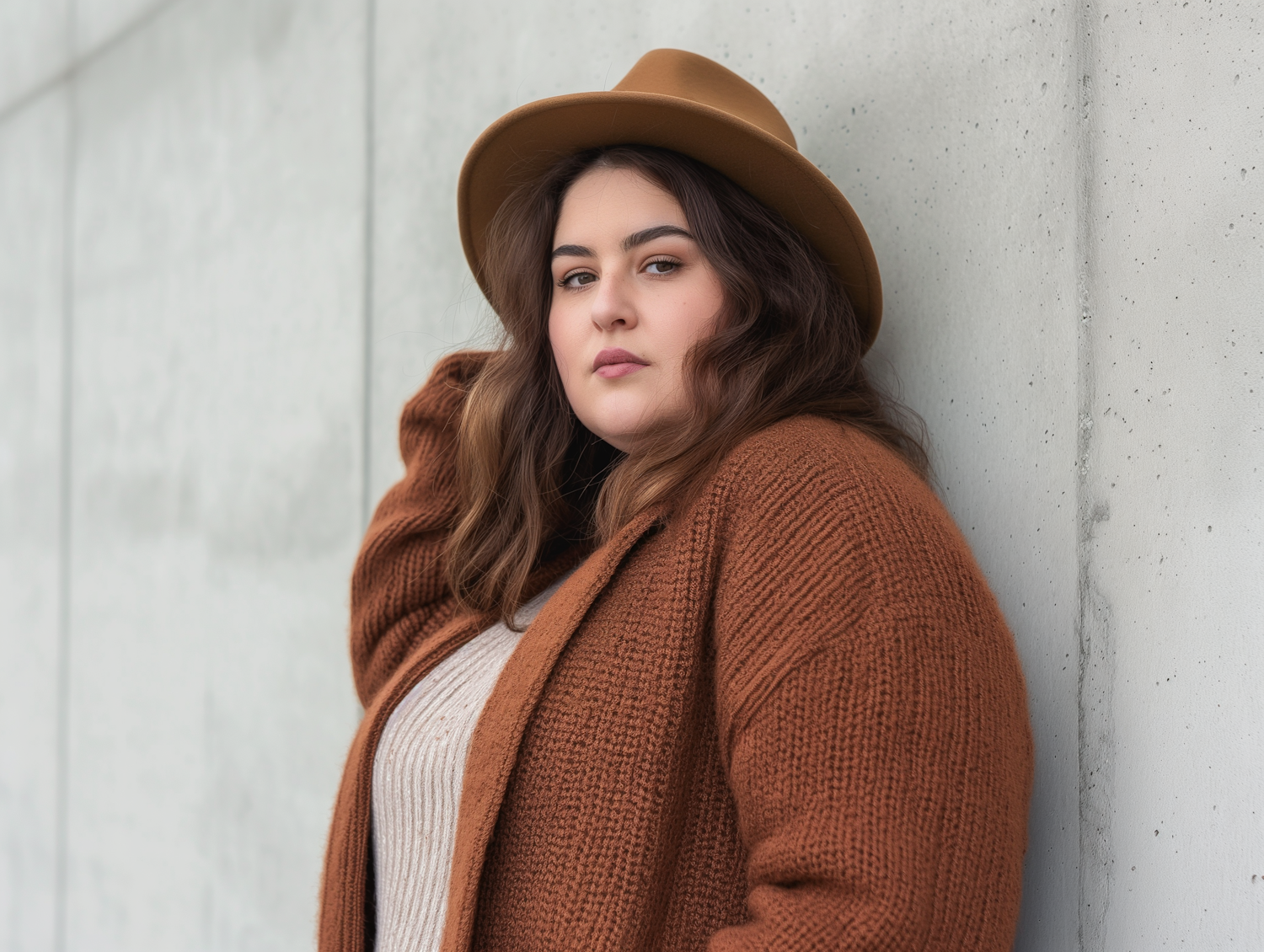 Confident woman in a brown hat and cardigan leans against a concrete wall, exuding a modern and minimalist vibe.