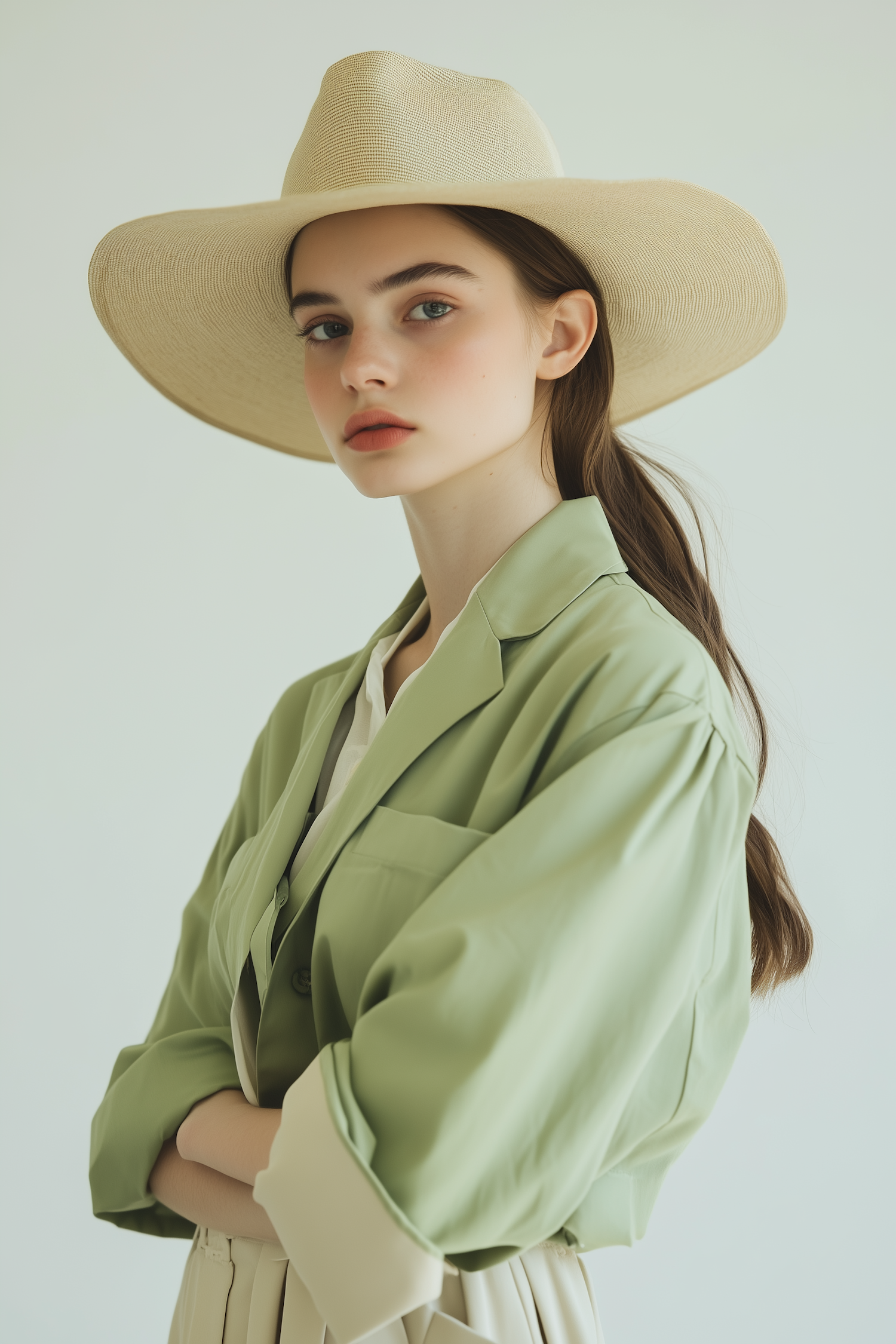 Elegant woman in a wide-brimmed hat and green jacket, exuding calm and style against a soft green background.
