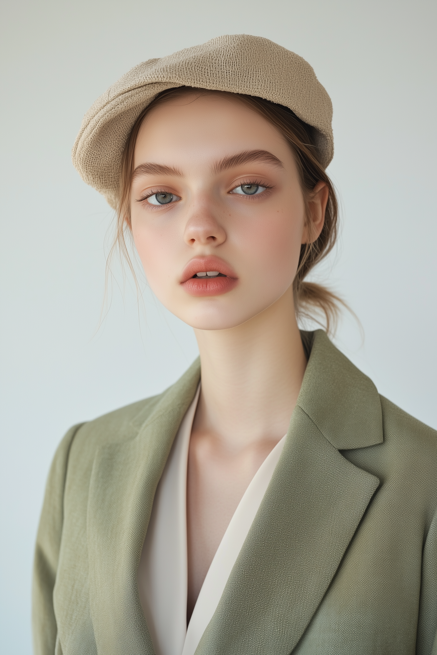Young woman in a beige beret and green blazer, with light blue eyes and fair skin, exuding elegance and sophistication.