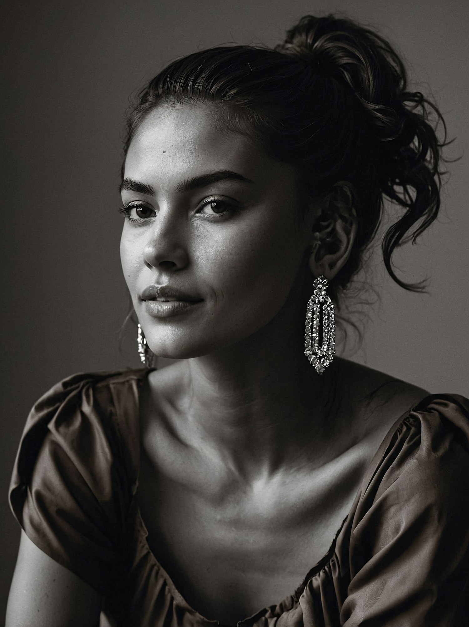Elegant black and white portrait of a young woman with ornate earrings and a serene expression, exuding timeless beauty.