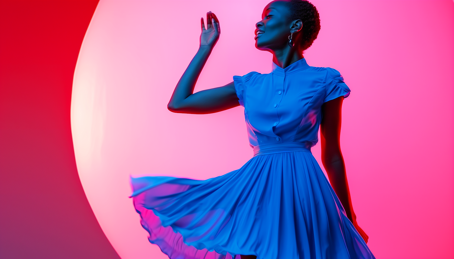 Elegant woman in a blue dress against a vibrant red and pink background, creating a striking silhouette effect.