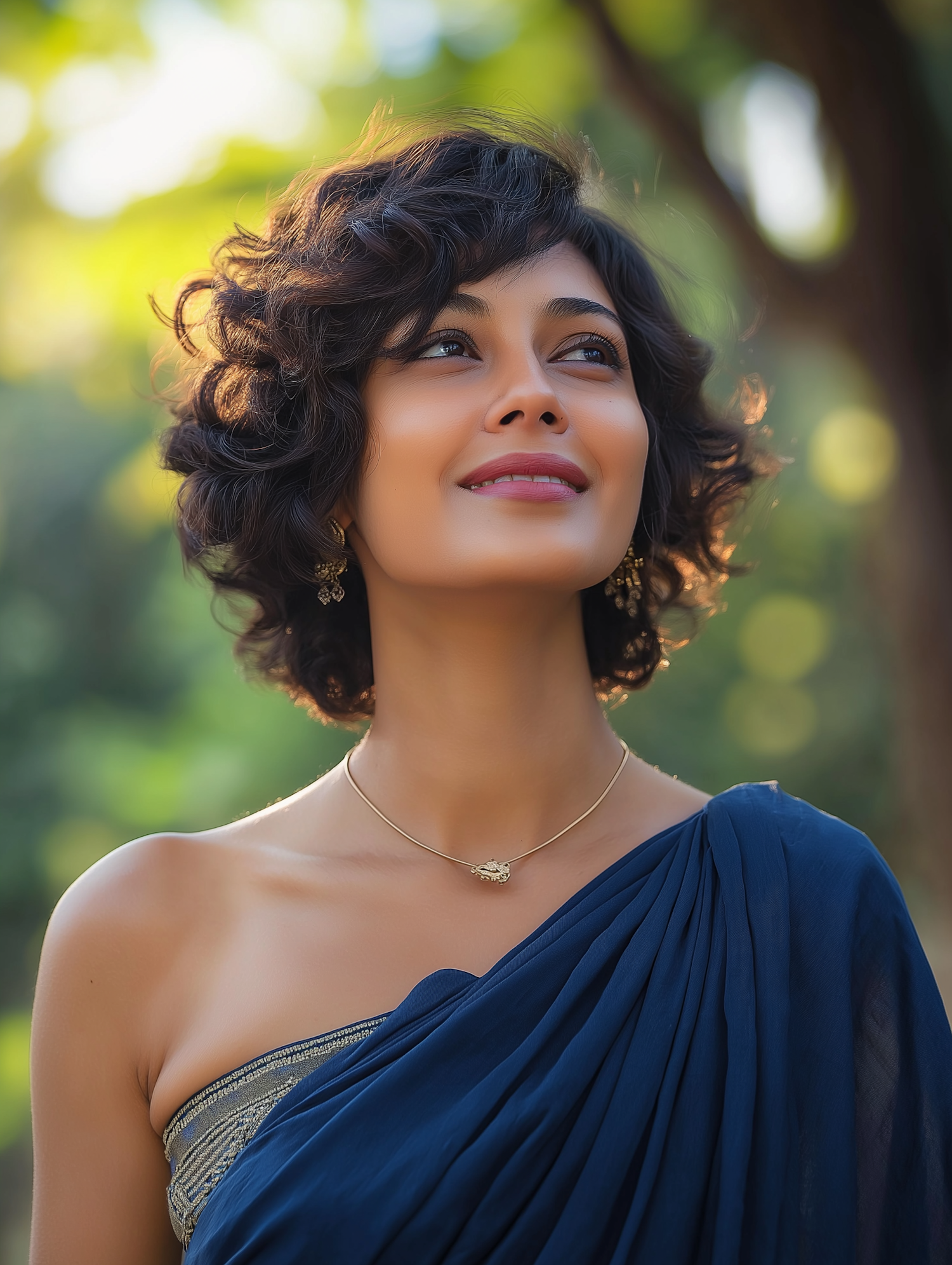 A serene woman with curly hair in a blue off-shoulder dress, adorned with gold jewelry, gazes upwards in a sunlit outdoor setting.