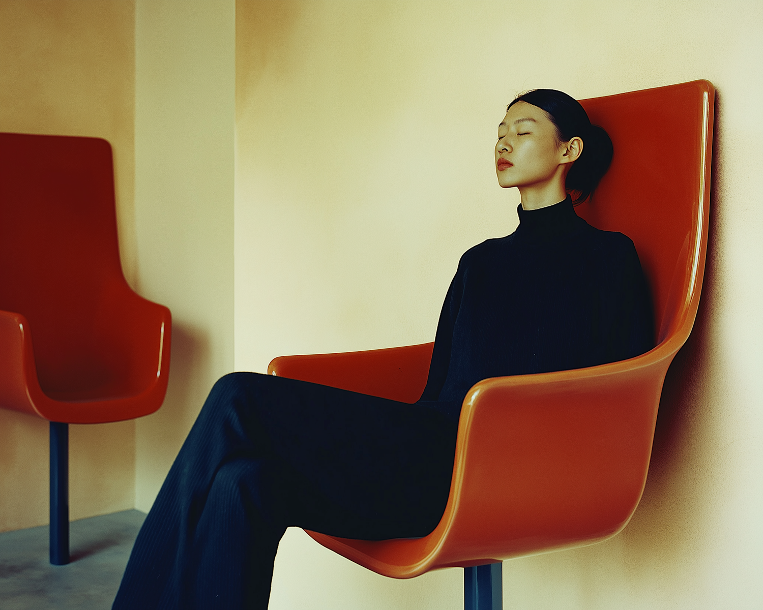 Minimalist portrait of a woman in a sleek orange chair, wearing black, with a calm expression against a beige background.