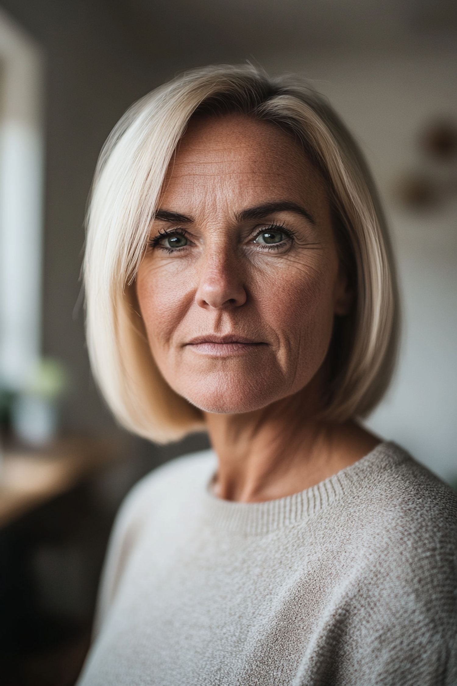 Portrait of a middle-aged woman with short blonde hair and green eyes, wearing a light sweater, in a softly lit indoor setting.