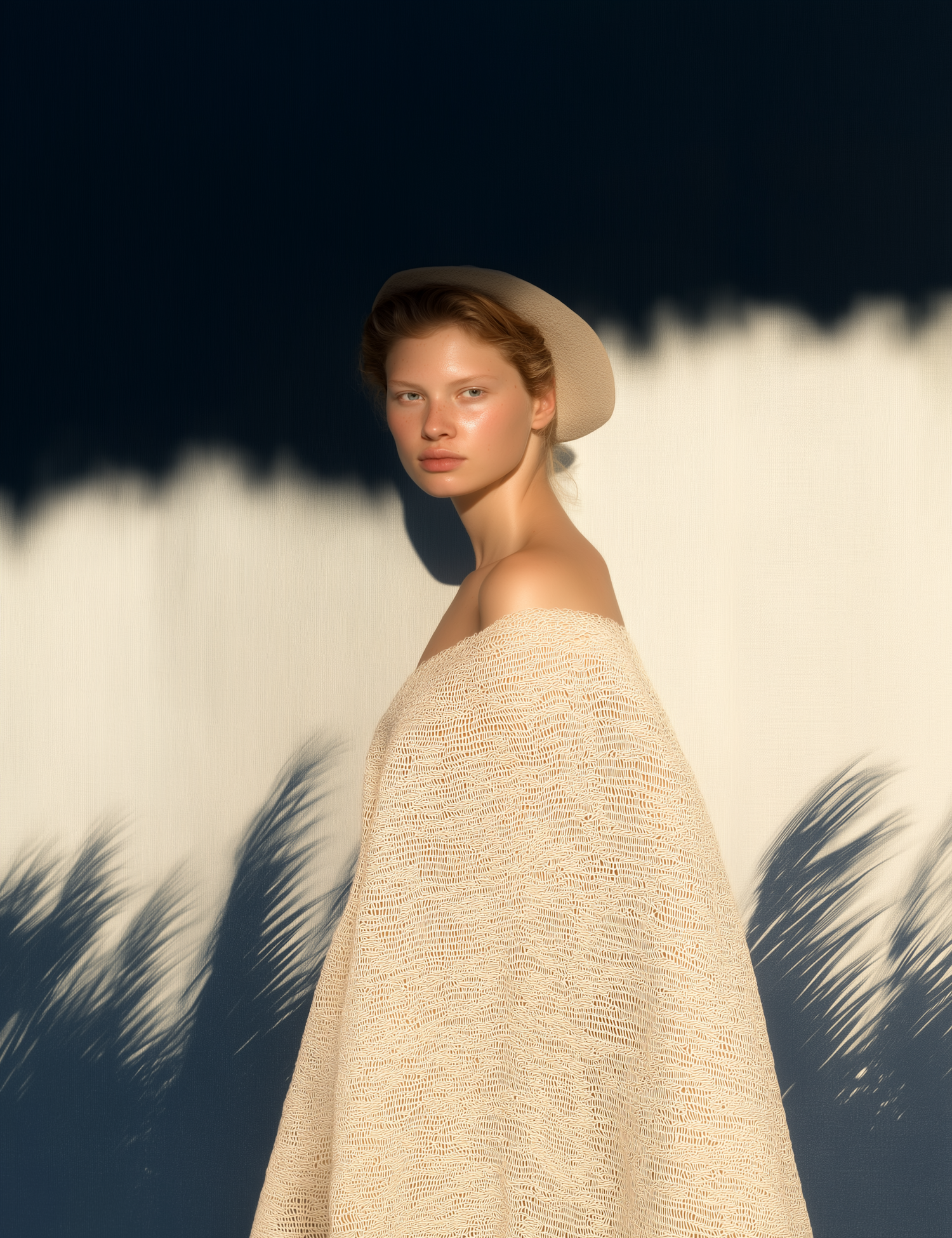 Elegant woman in cream fabric and beret against a dramatic light and shadow backdrop, creating a minimalist and artistic composition.