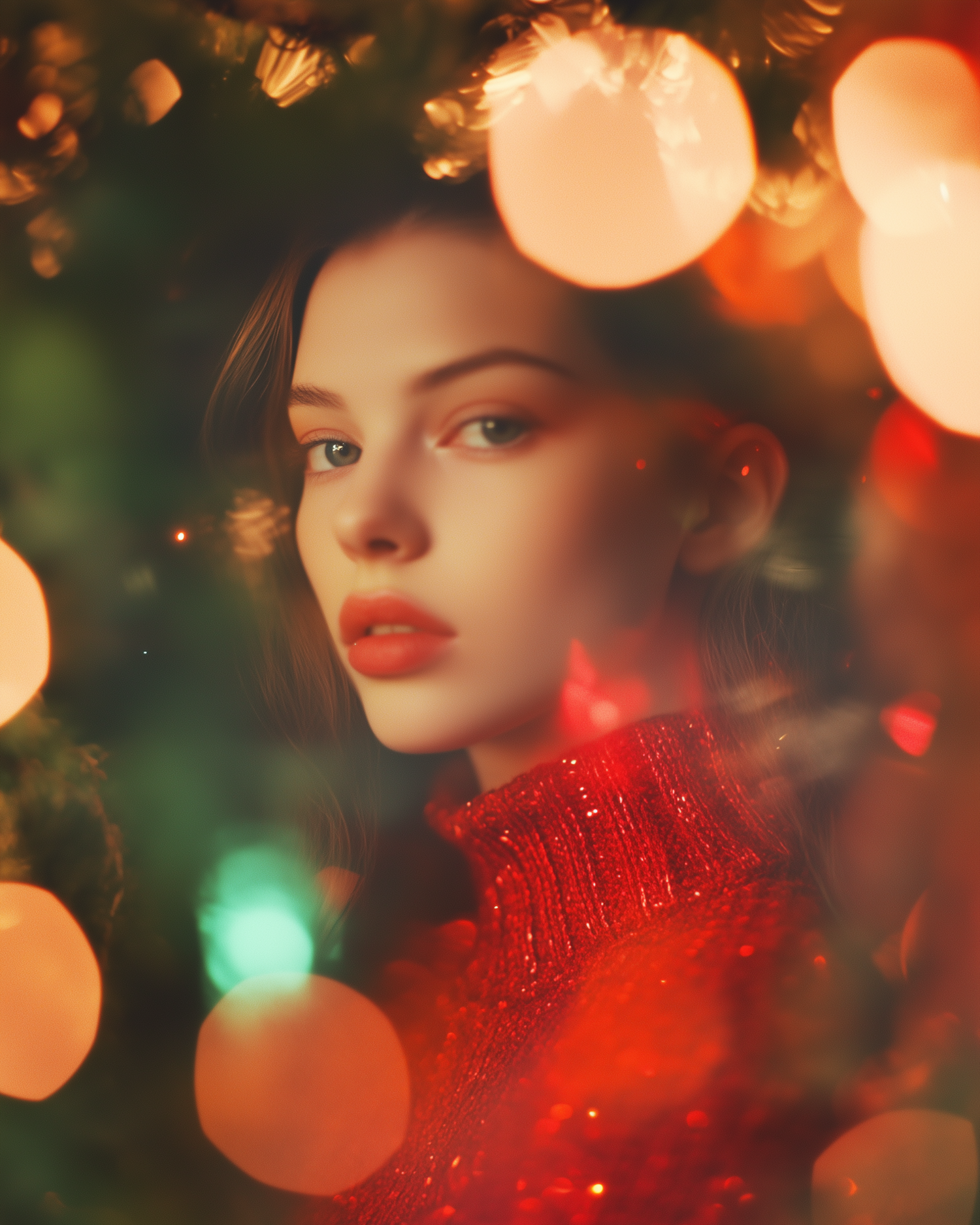 A serene woman in a red sweater surrounded by festive bokeh lights, creating a dreamy and warm atmosphere.