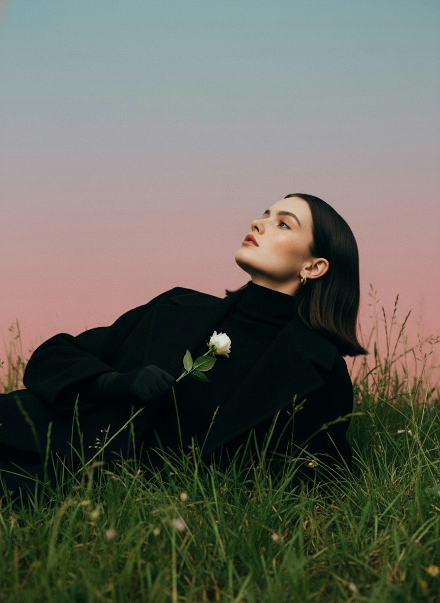 A serene portrait of a woman in black attire holding a white rose, set against a gradient pink-to-blue sky and lush green grass.