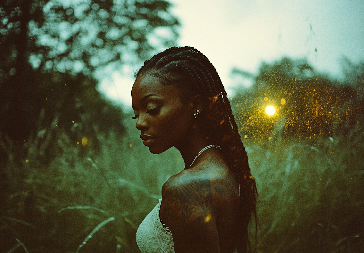 A serene portrait of a woman with braids in a grassy field, bathed in warm, golden light, creating a peaceful and dreamy atmosphere.