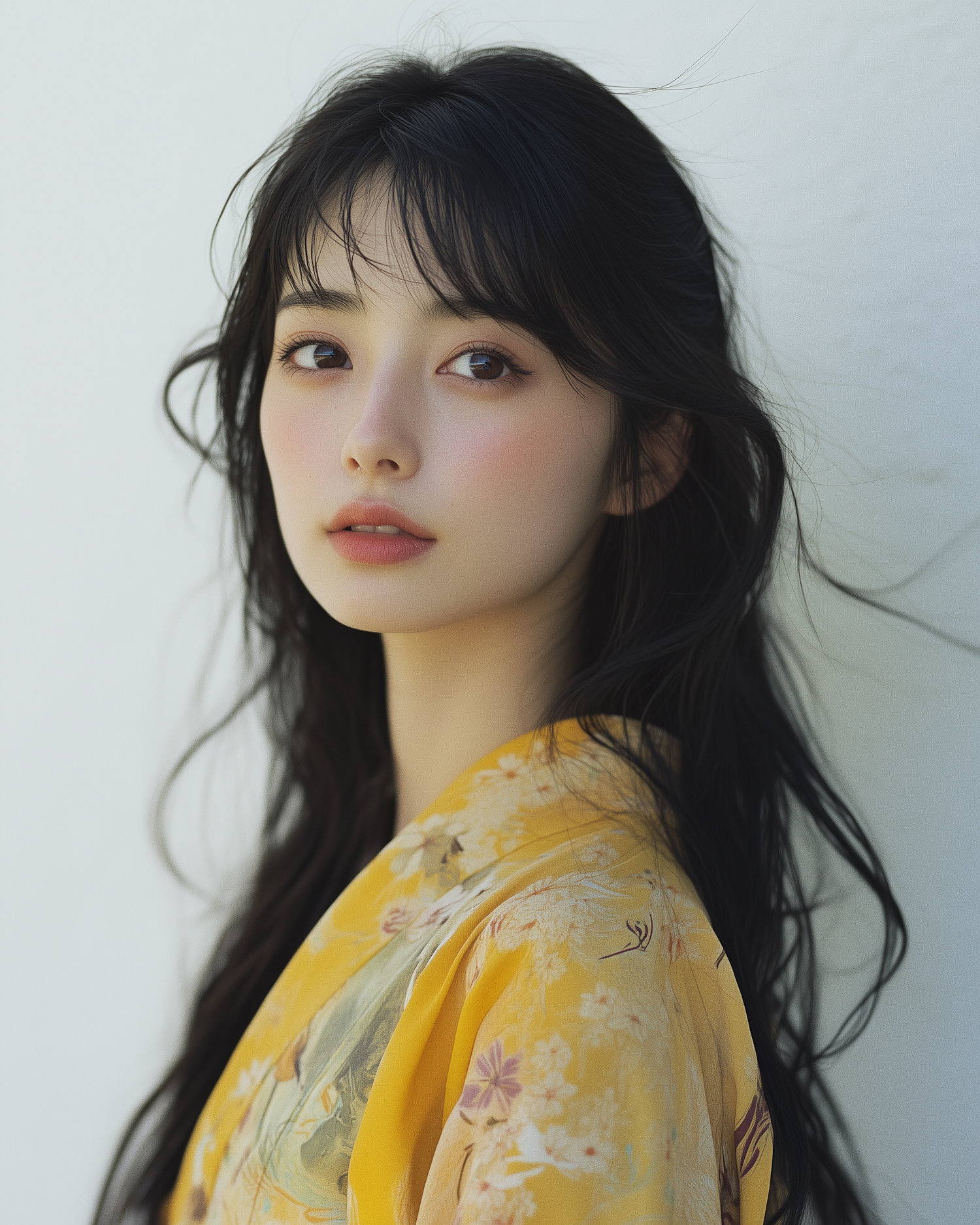 Asian woman in a yellow floral kimono with long black hair, gazing softly. Elegant and serene portrait against a light background.