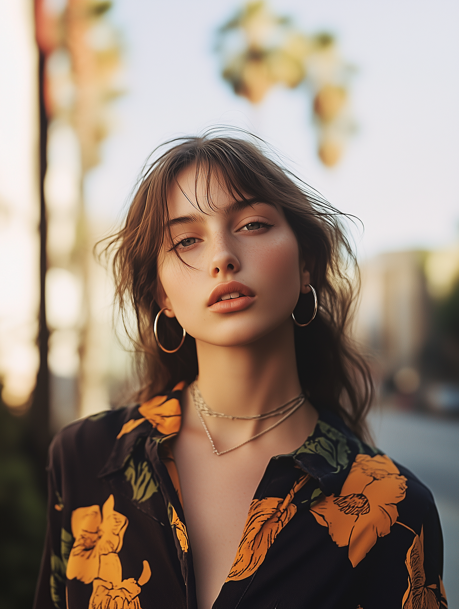 Young woman with wavy brown hair and hoop earrings in a floral shirt, set against a sunny, blurred background with palm trees.