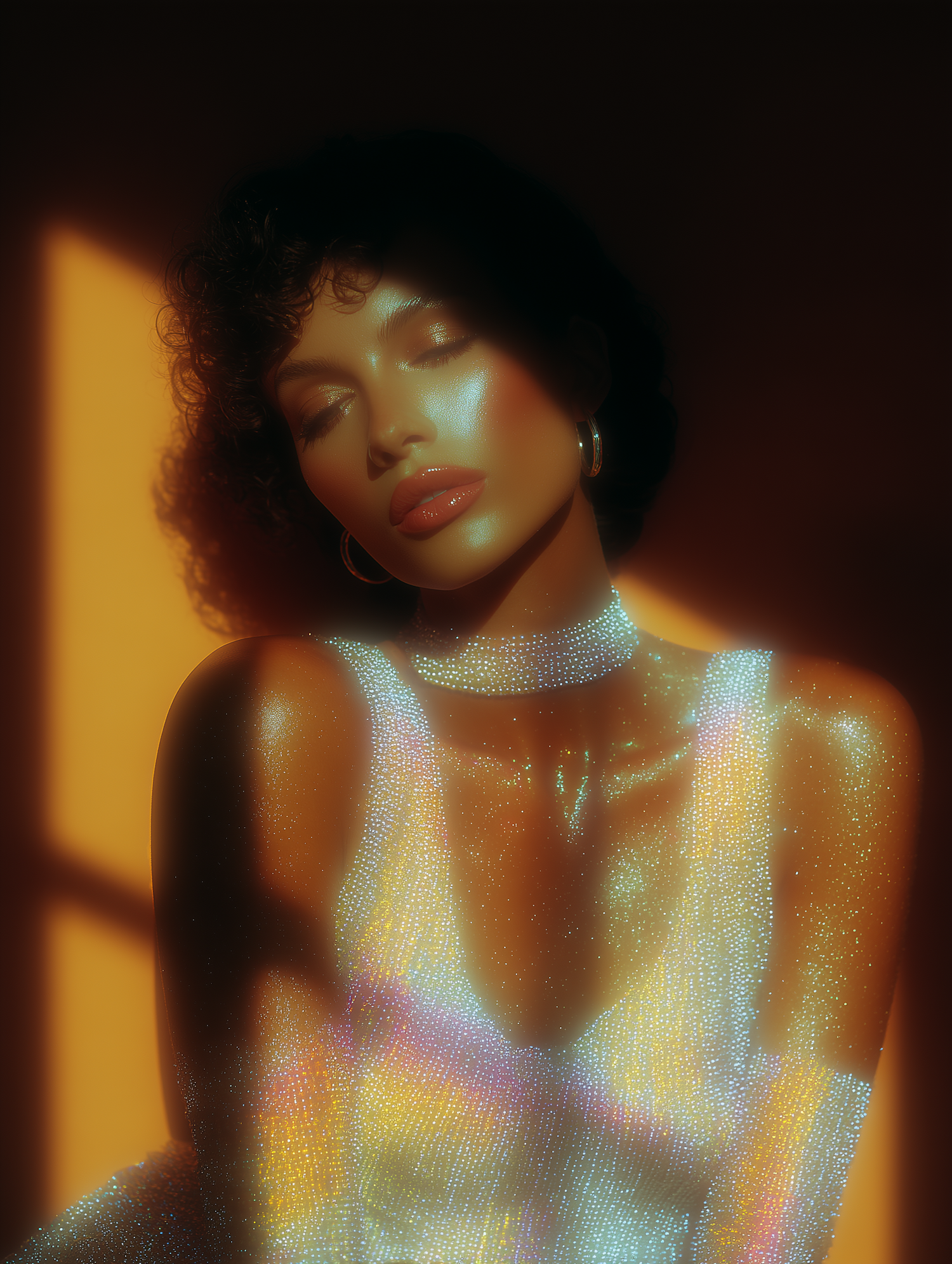 A serene woman in a sparkling outfit basks in warm, glowing light, creating a dreamy and ethereal atmosphere.