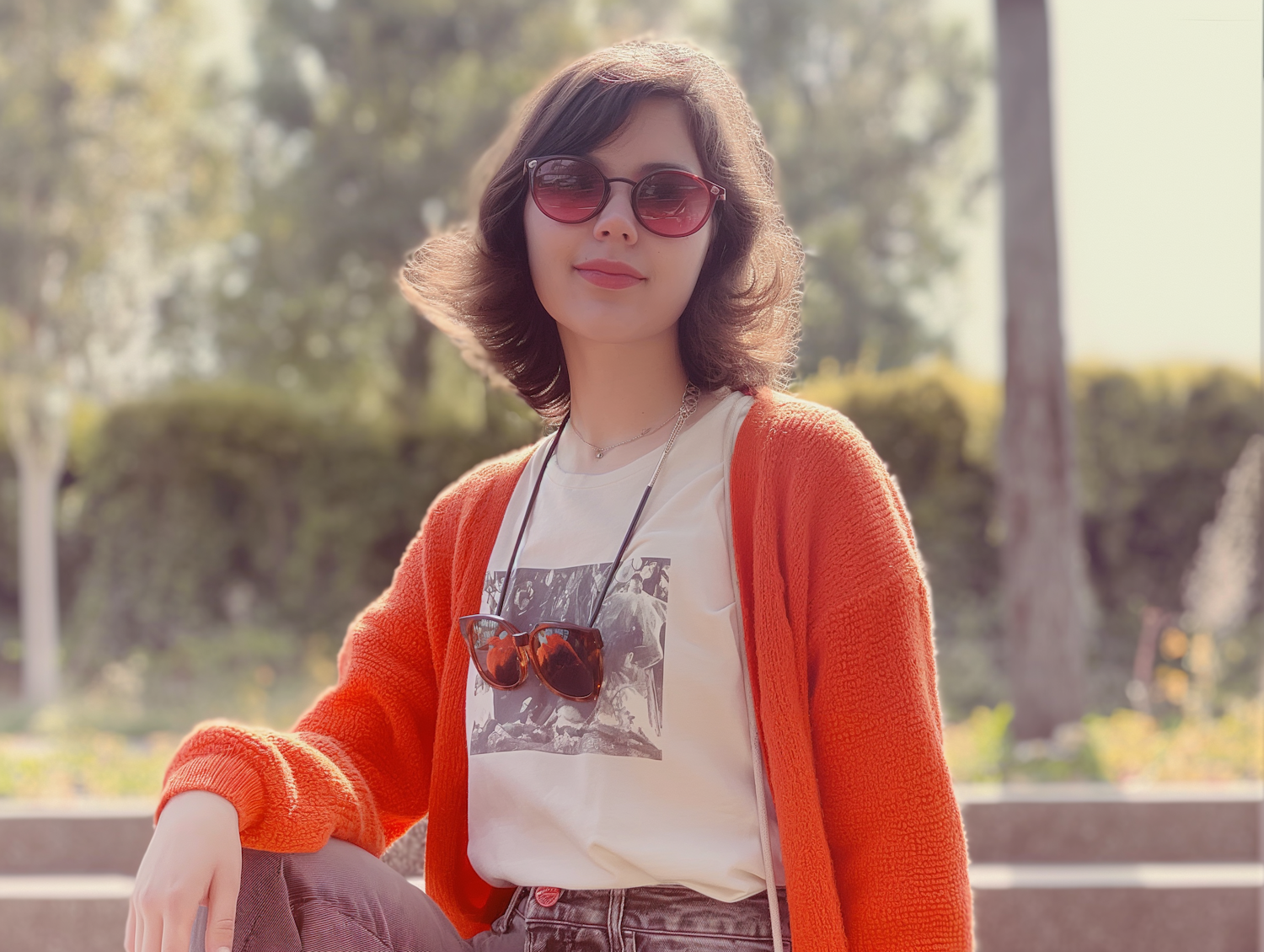 Young woman in orange cardigan and sunglasses, standing outdoors with a confident smile. Sunlit park background adds a serene vibe.