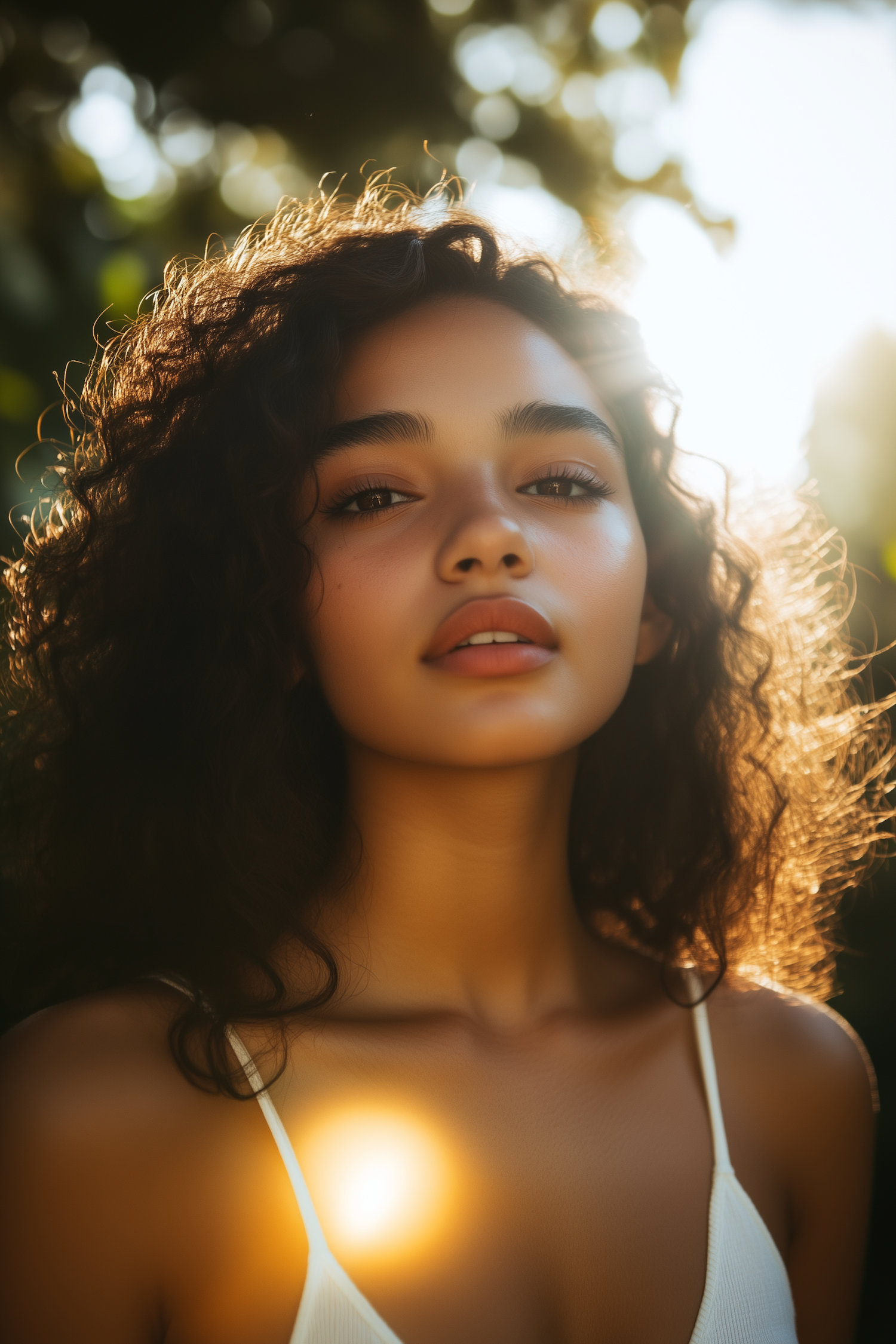 Portrait of a young woman with glowing curly hair in sunlight, wearing a white top, surrounded by blurred green foliage.