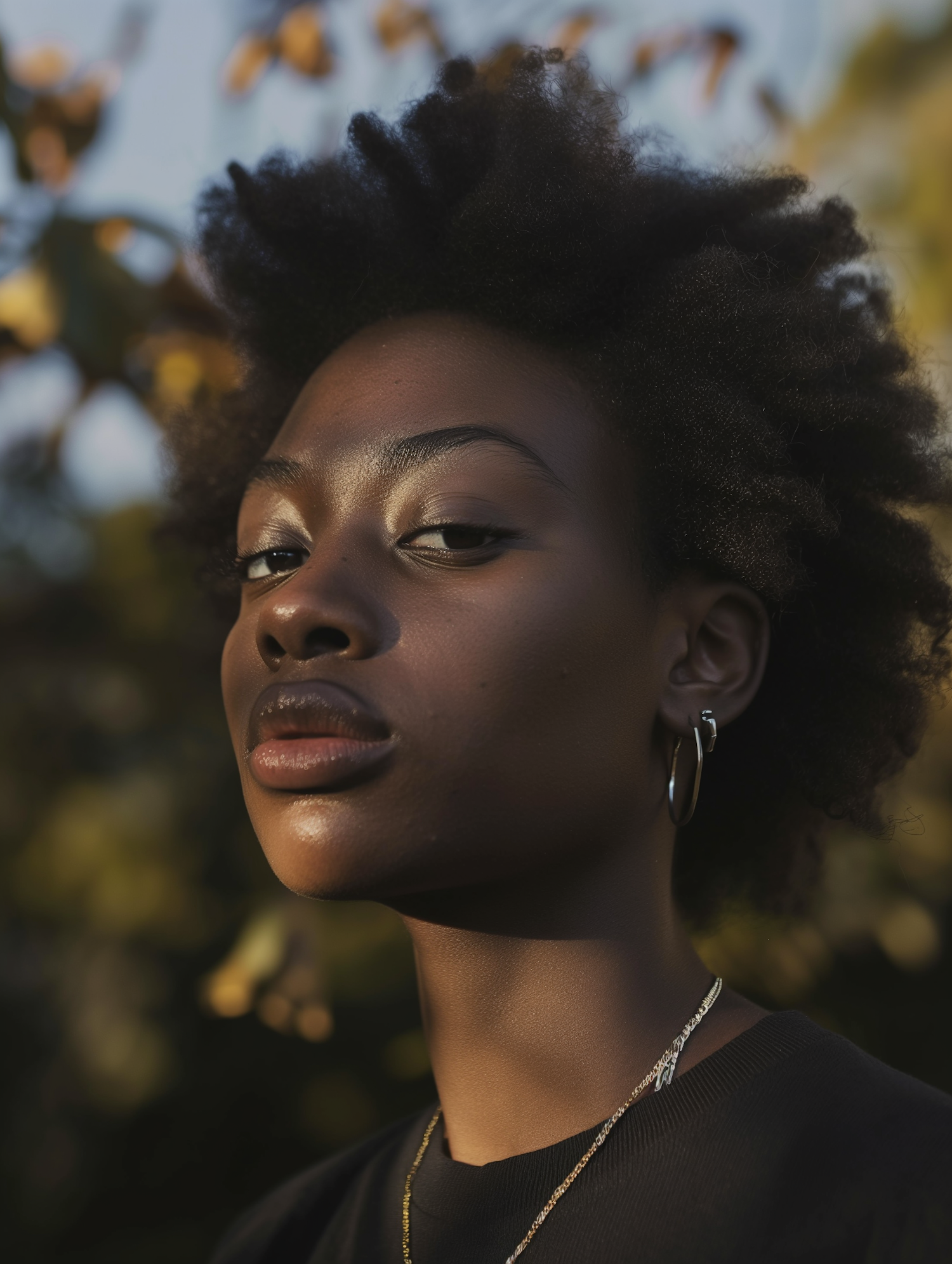Portrait of a young Black woman with afro hair, wearing hoop earrings and a gold necklace, set against a blurred natural background.
