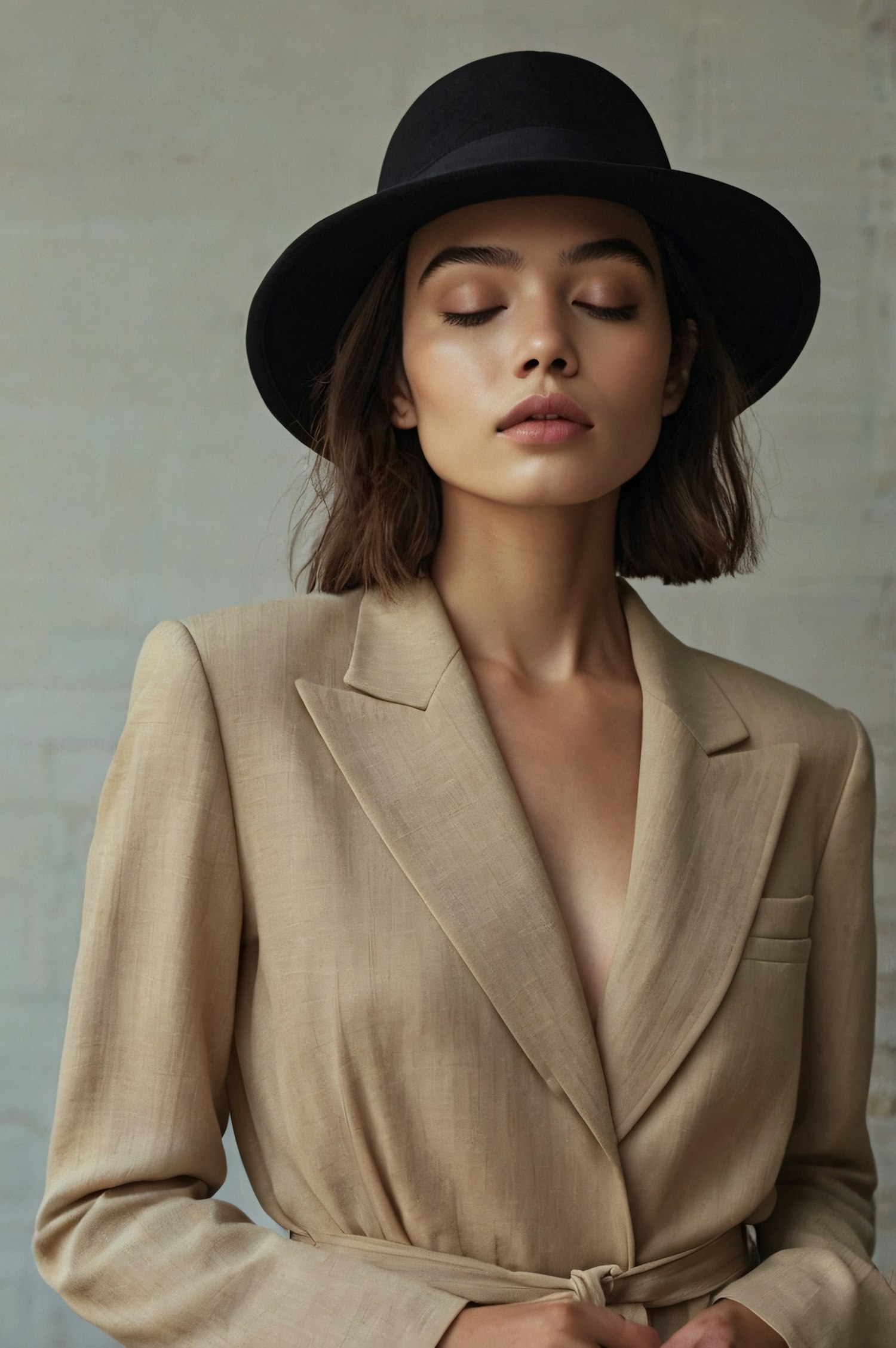 Elegant woman in beige blazer and black hat with serene expression, eyes closed. Minimalist and sophisticated fashion portrait.