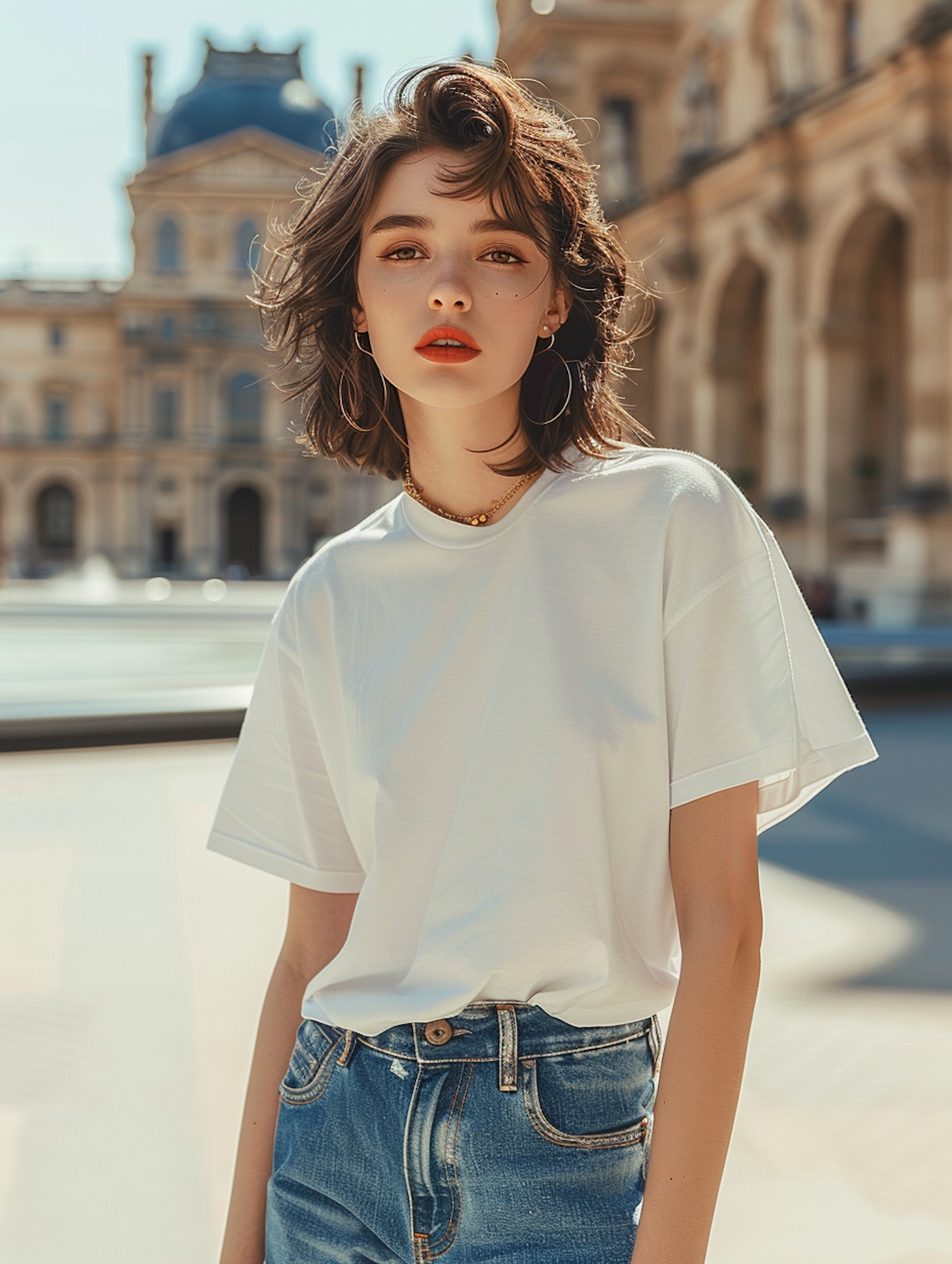 Stylish young woman in white t-shirt and jeans poses in front of historic European architecture, exuding confidence and elegance.