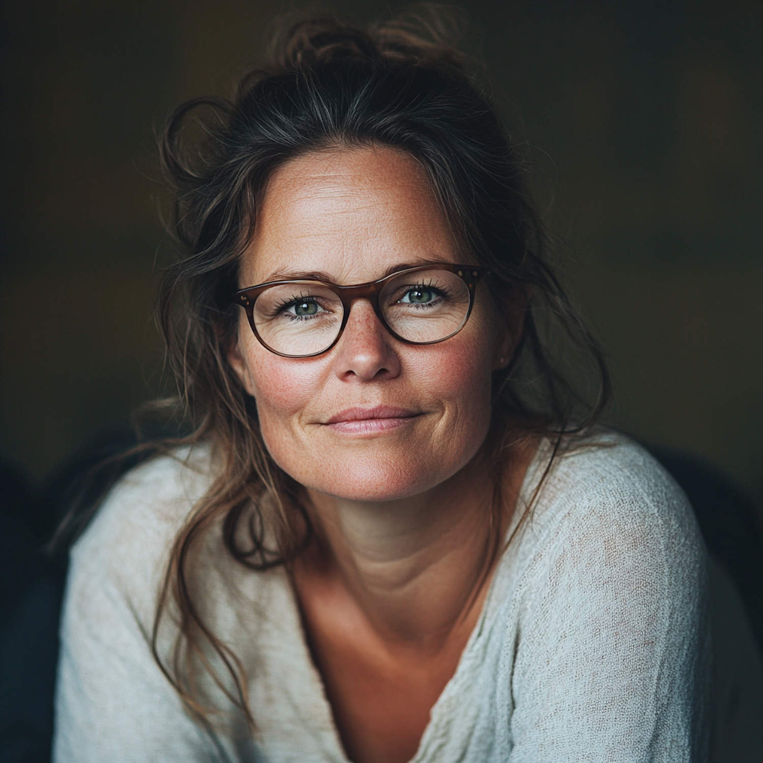 Close-up portrait of a woman with glasses, light brown hair, and a calm expression, set against a softly blurred background.