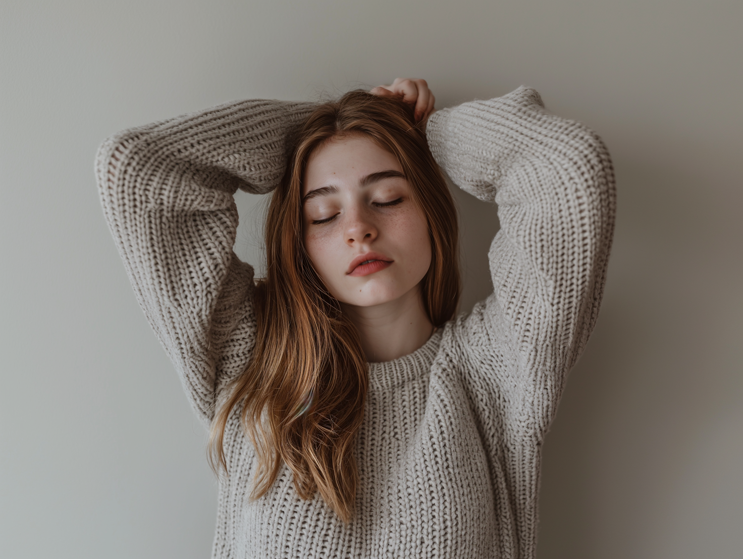 Young woman in a cozy sweater with closed eyes, exuding calmness and serenity against a plain background.