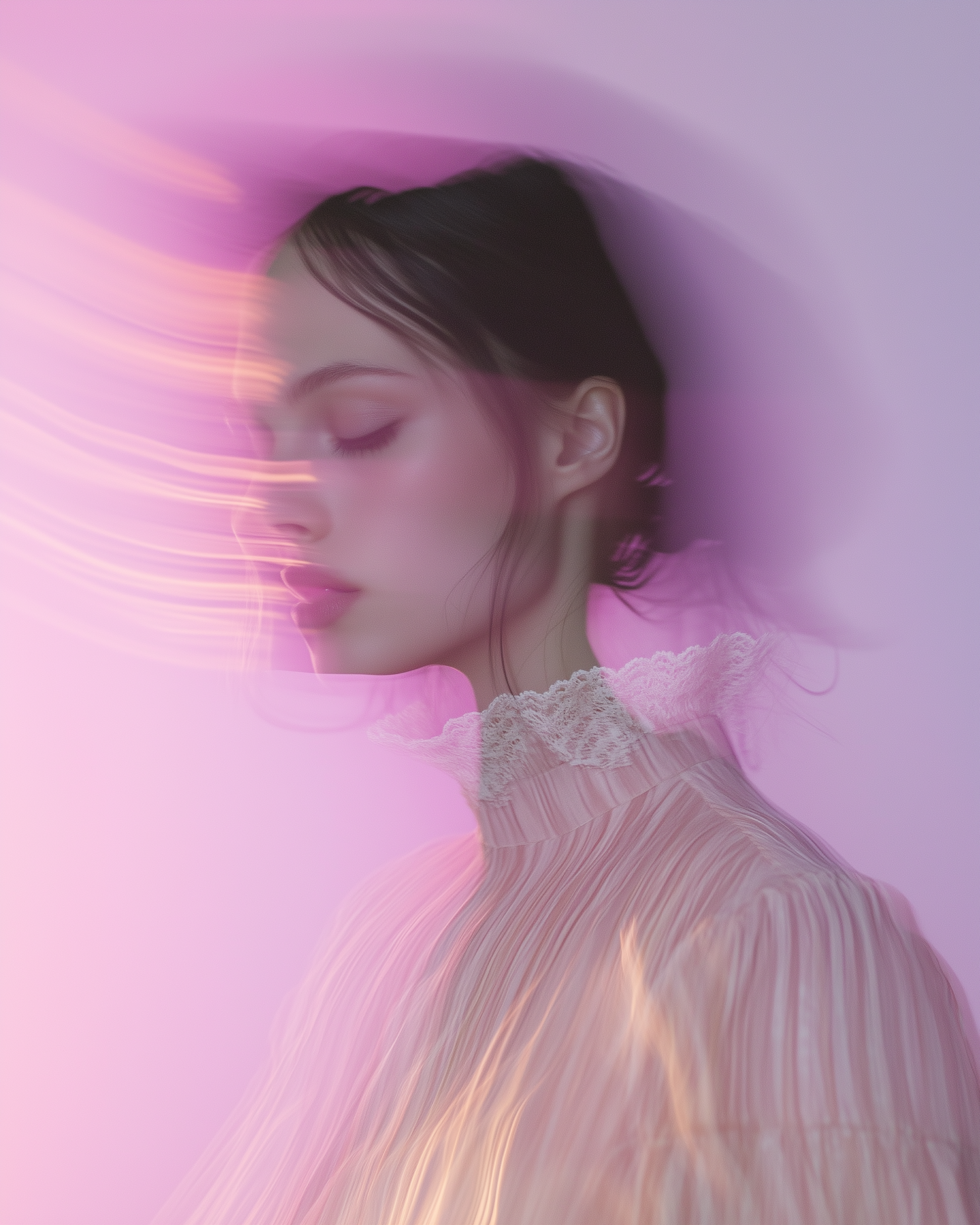 Ethereal portrait of a woman in soft pink hues with motion blur, wearing a lace-detailed blouse. Dreamy and serene atmosphere.